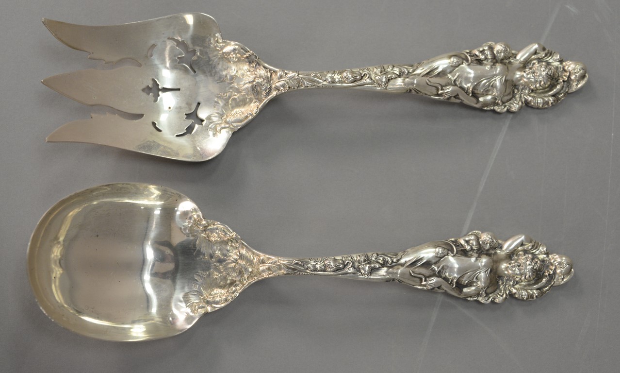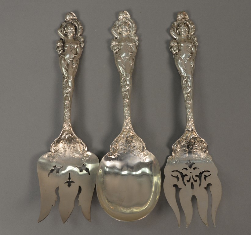 Reed & Barton Love Disarmed three piece sterling silver lot including two salad forks and salad spoon. Fork: lg. 10 1/2 in. spoon: lg. 10 1/4 in. 22.2 t oz.