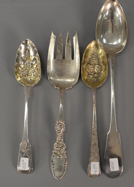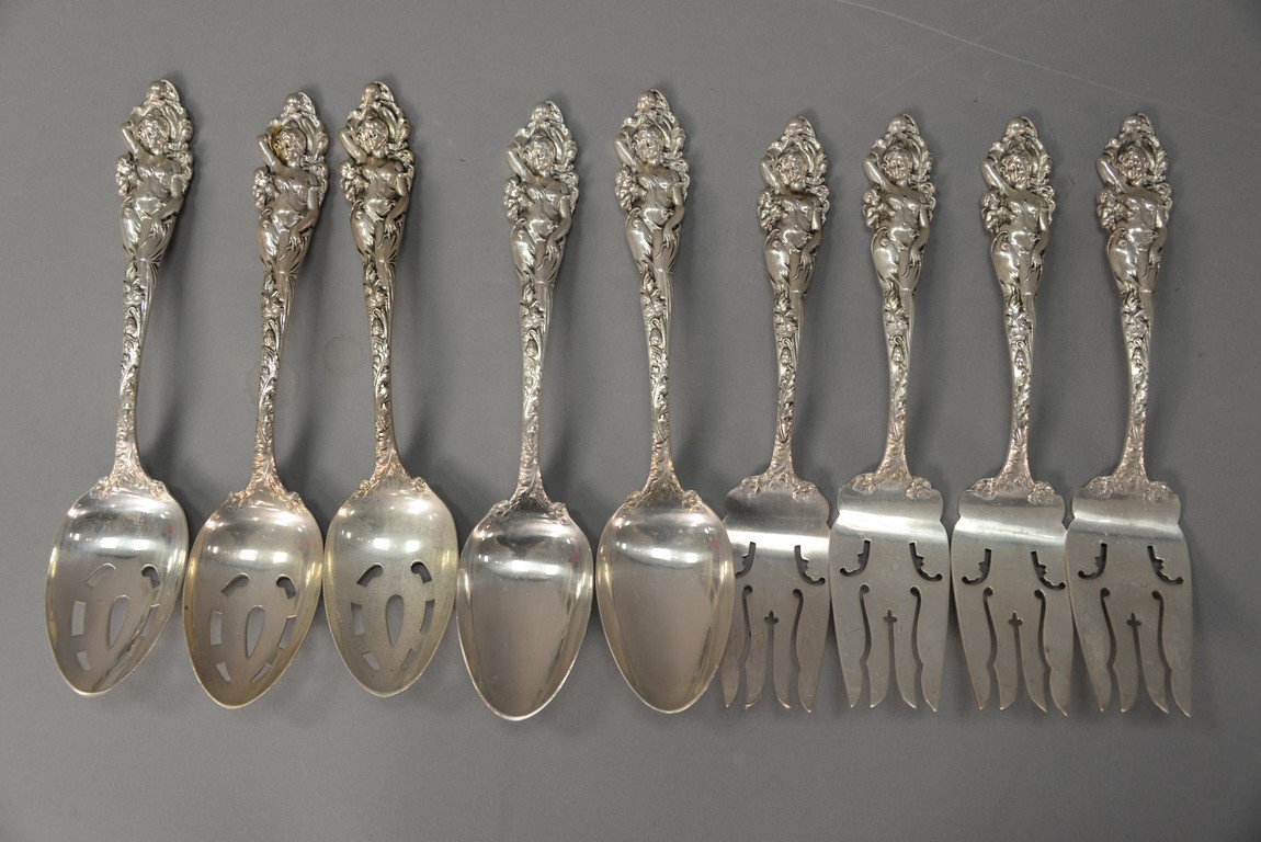 Reed & Barton Love Disarmed nine sterling service pieces to include two serving spoons lg. 8 1/4 in. three pierced serving spoons lg. 8 1/4 in., and four serving cold meat forks lg. 7 3/4 in. 28.1 t oz.
