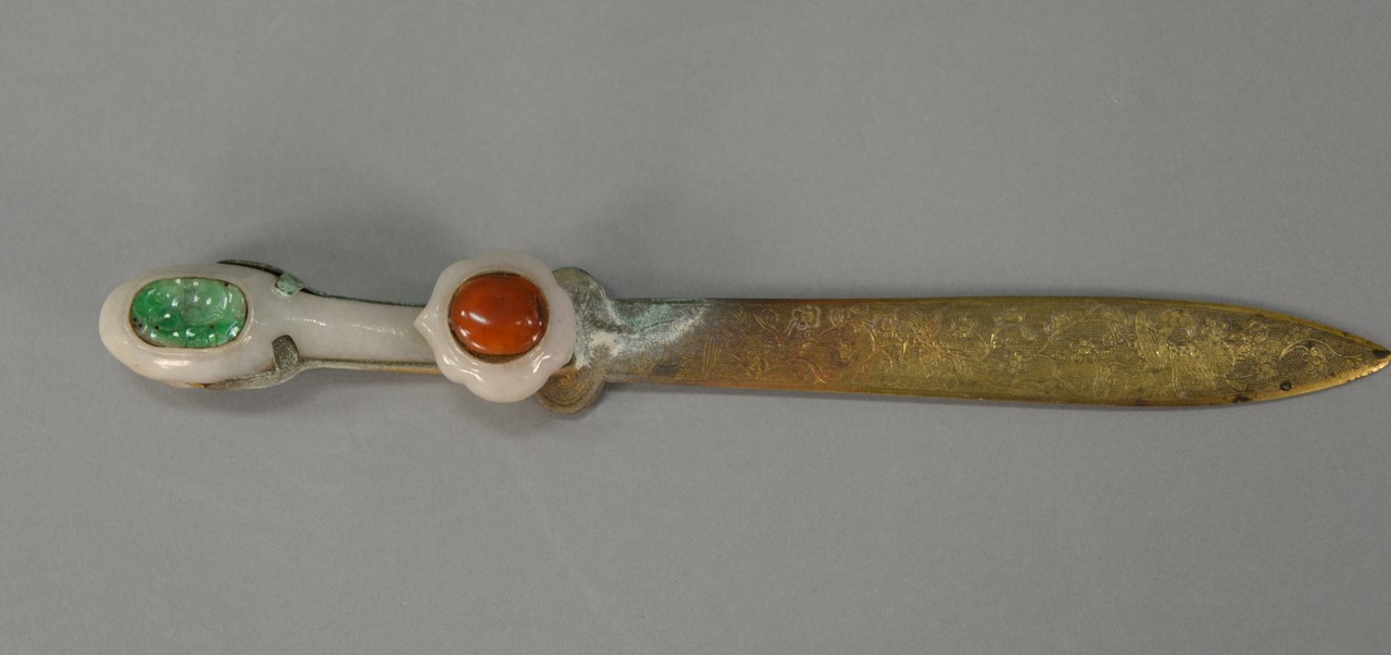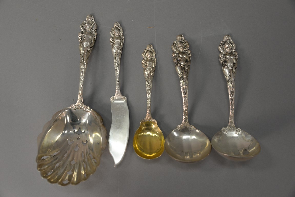 Reed & Barton Love Disarmed five sterling silver pieces to include pea/cracker server lg. 8 3/4 in., two gravy ladles lg. 6 1/2 in., master butter knife lg. 7 1/2 in., and preserve spoon lg. 6 in. with gold washed bowl. 12.6 t oz.