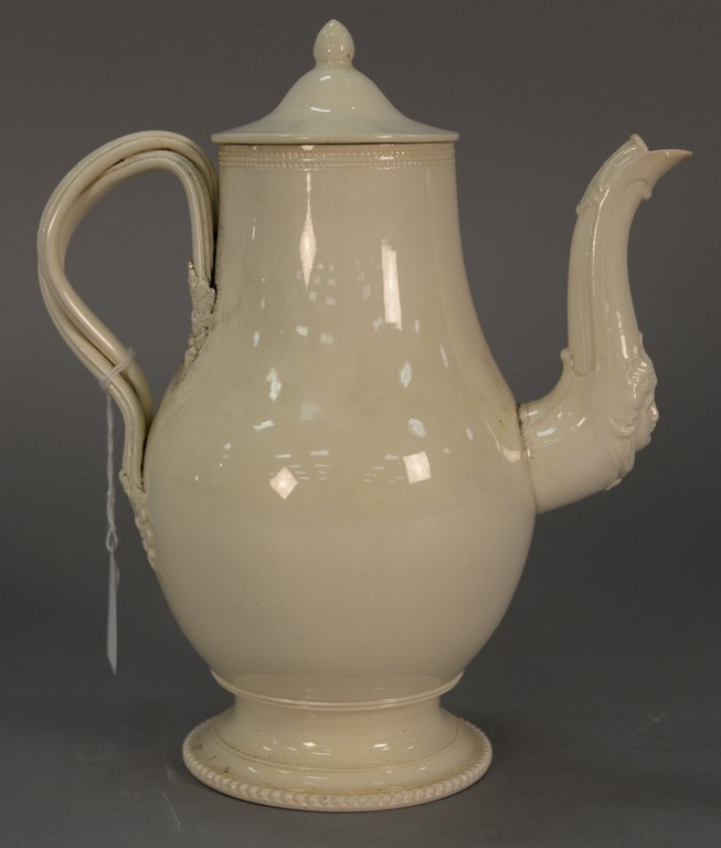 English creamware coffee pot having round cover over slender bulbous body with spout of bust of woman and entwined handle on molded foot small chips. ht. 10 in.