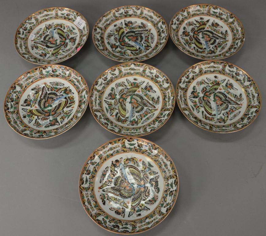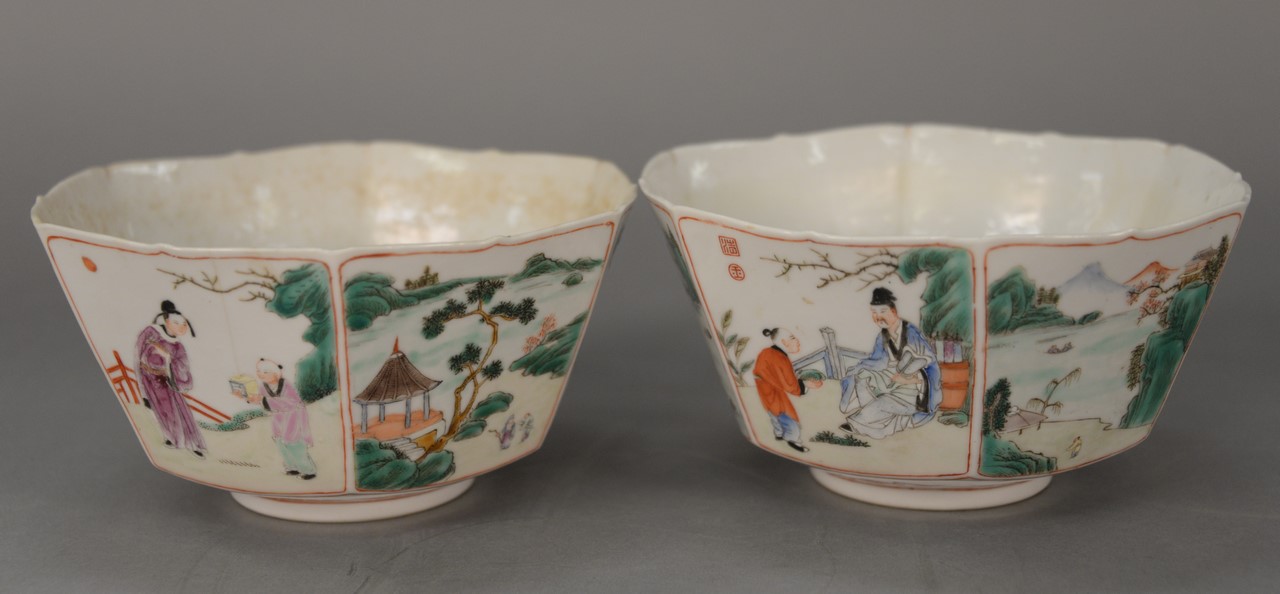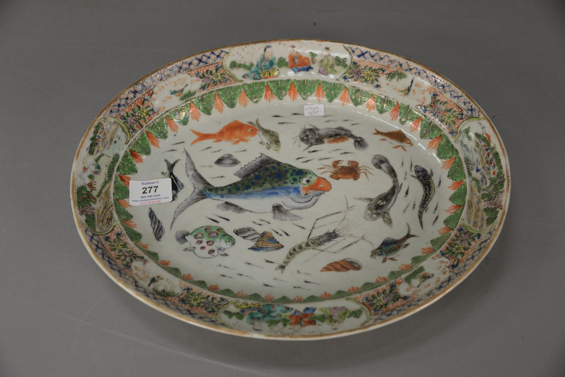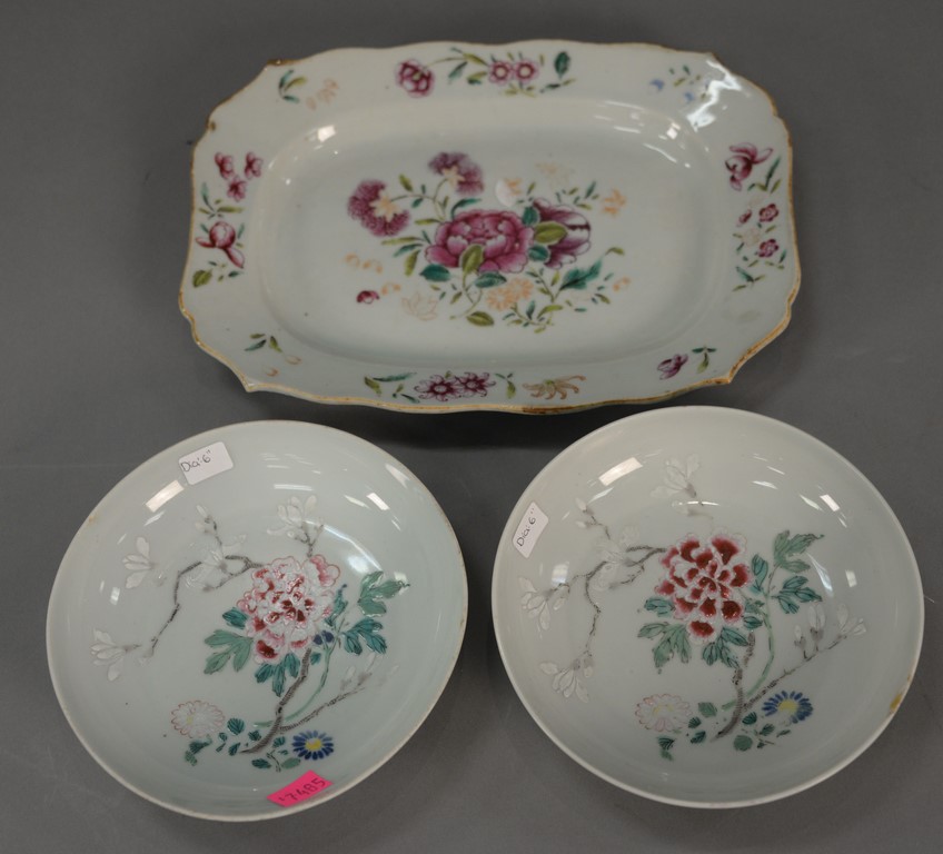 Three Famille Rose dishes including two small bowls with painted blossoming flowers with Yong Zheng mark on bottom and oblong dish with flowers. bowl: dia. 6 in. dish: lg. 10 in.