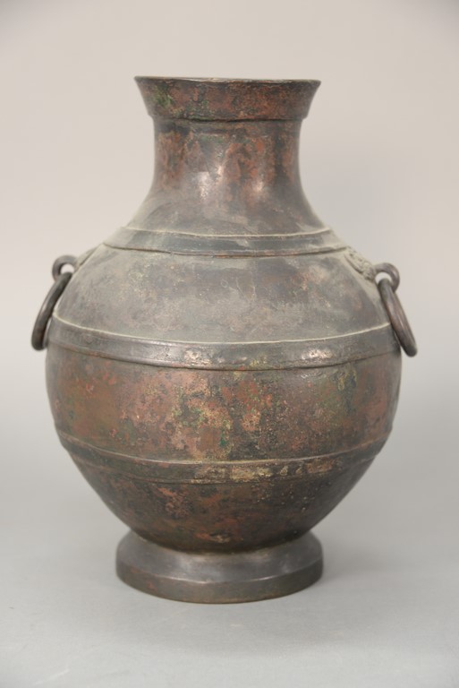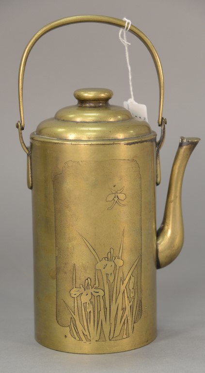 Chinese brass teapot having swing handle and round lid on cylindrical body embossed on one side with flowers, opposite side with Chinese characters, signed under lid, makers mark on bottom, probably 19th century or earlier. total ht. with handle 10 1/2 in.