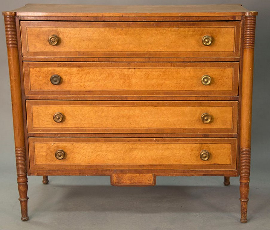 Sheraton chest of four drawers having cookie corners, curly maple drawer fronts with mahogany and lightwood surrounds, all on turned legs and with rectangular drop in center, probably New Hampshire circa 1820-1830. ht. 37 1/4 in. wd. 40 1/4 in. dp. 20 in.
