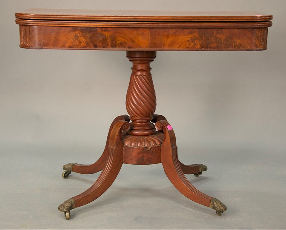 Duncan Phyfe mahogany game table having rectangular top over conforming frieze set on twist turned pedestal on base joined by four reeded downswept members ending in brass paw feet, circa 1820-1830. ht. 28 1/2 in. wd. 36 in. dp. 18 in.