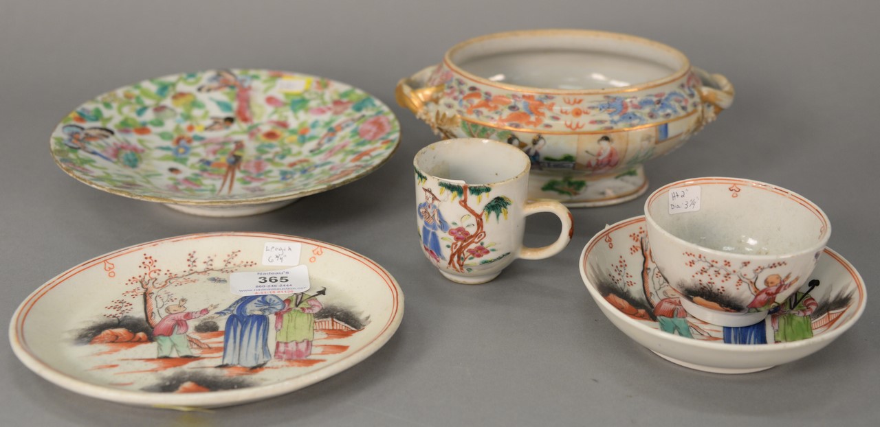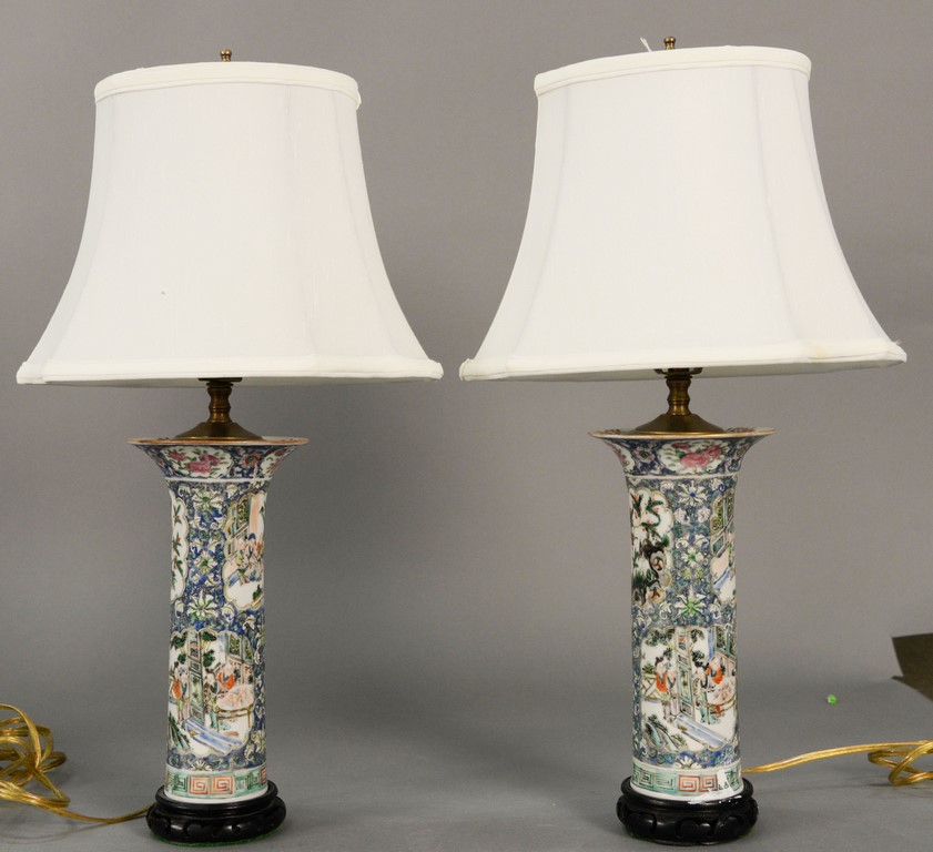 Pair of small Famille Rose porcelain sleeve vases with two painted panels of birds on bamboo trees and two painted panels with scholars, made into table lamps. vase ht. 9 1/4 in. total ht. 21 in.