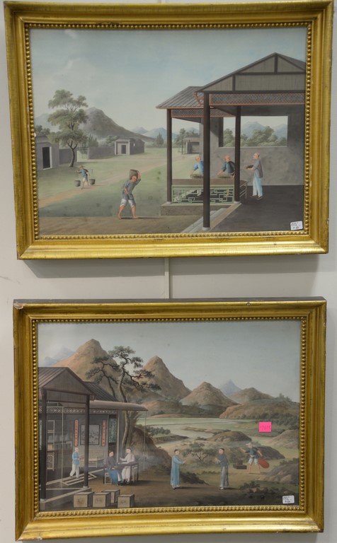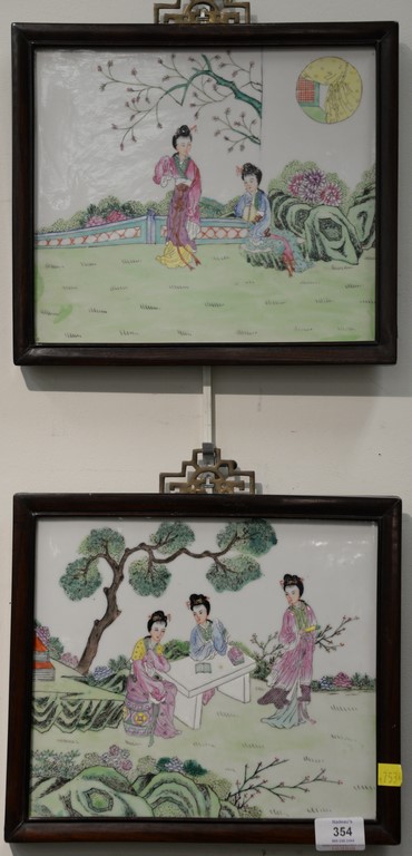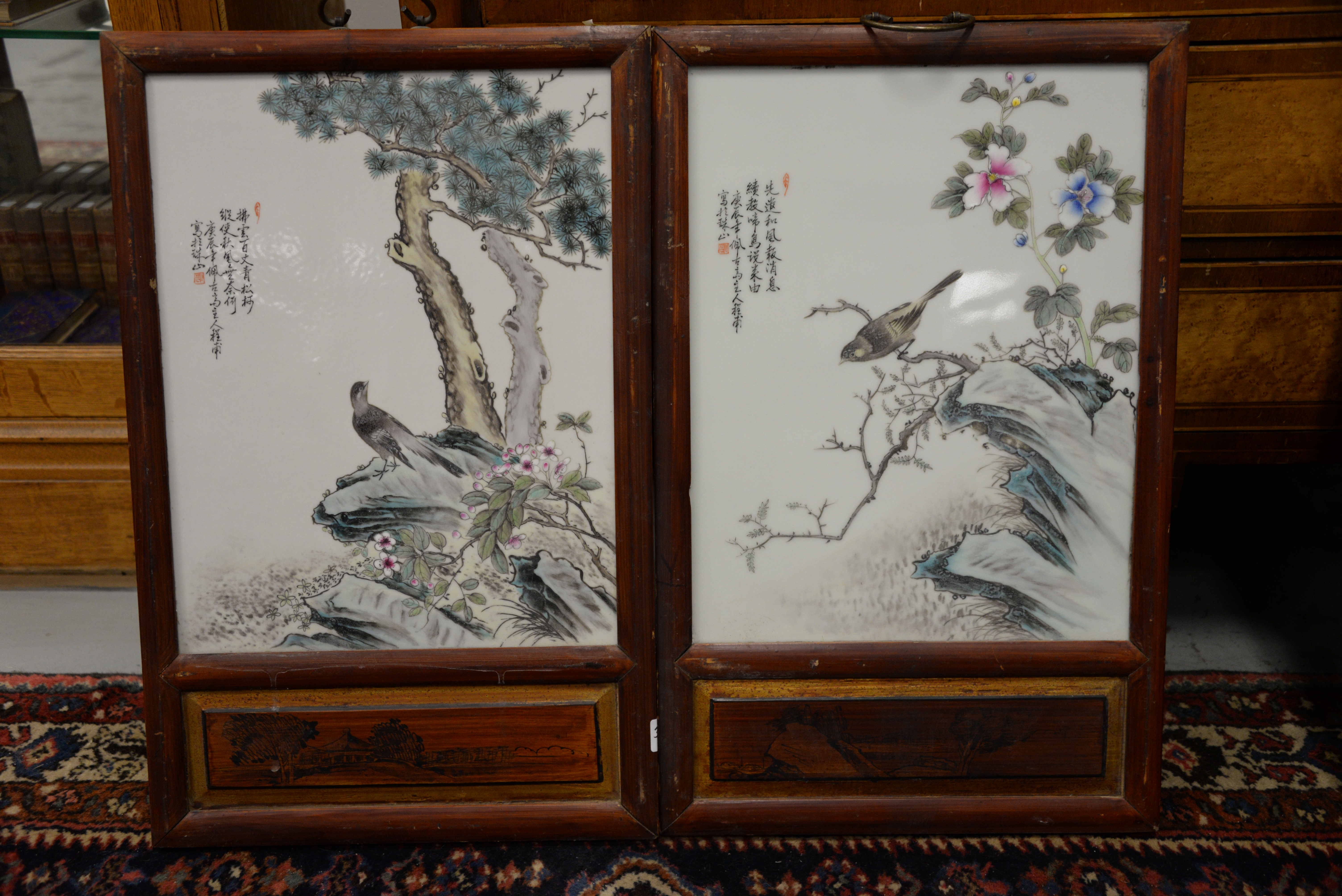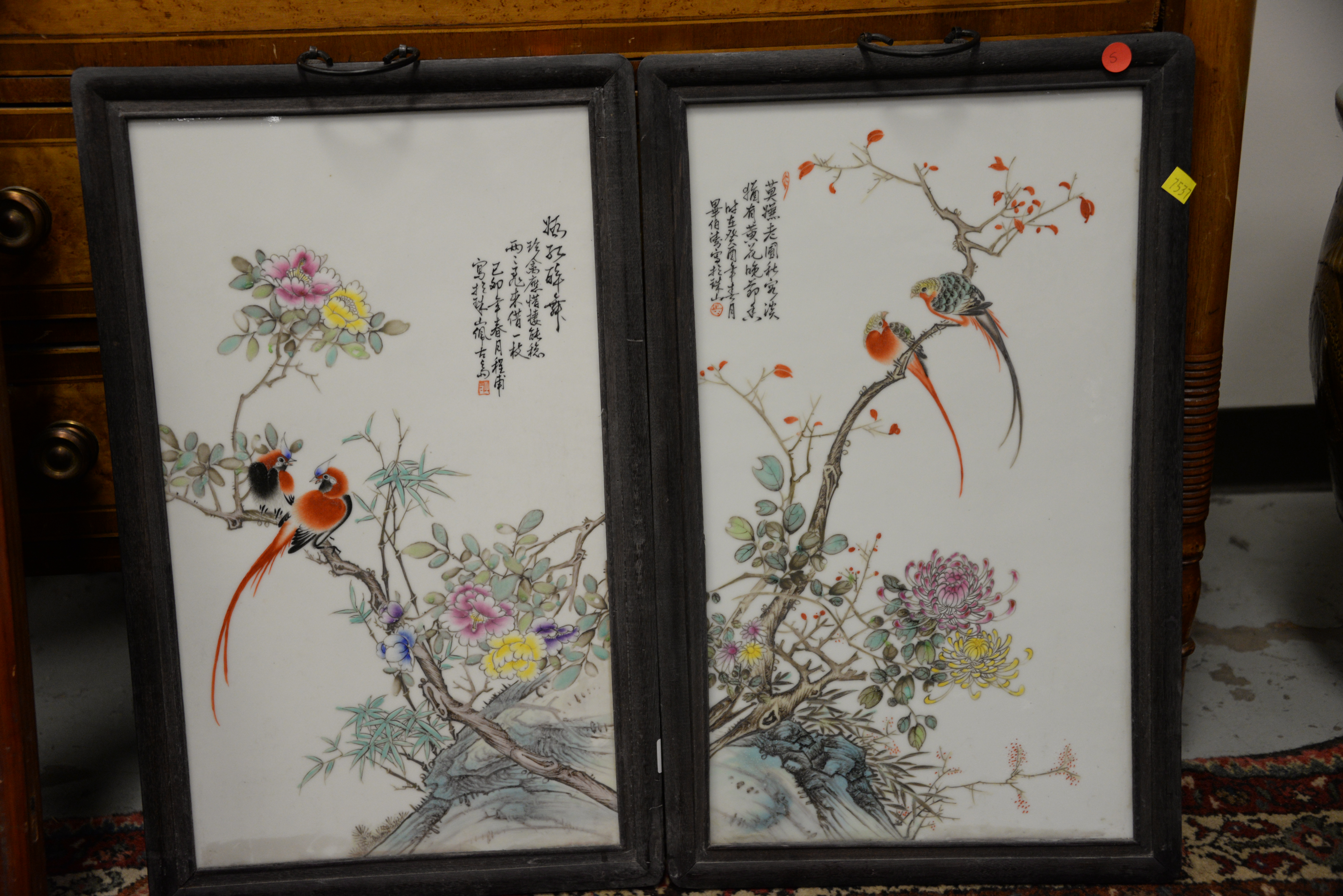 Pair of porcelain plaques, one with bird and flowers and one with bird, tree, and flowers, each signed upper right in bamboo frames. plaque size: 17 x 13