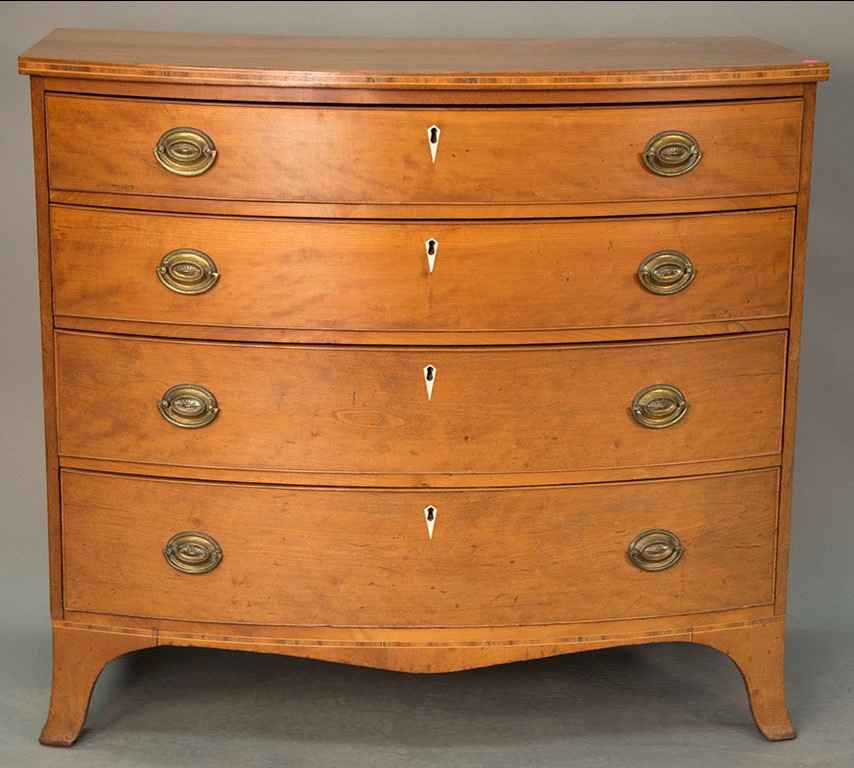 Federal cherry bowed front chest of four drawers on flared French feet and original oval brasses, circa 1790-1810. ht. 37 1/4 in. wd. 40 3/4 in. dp. 23 in.