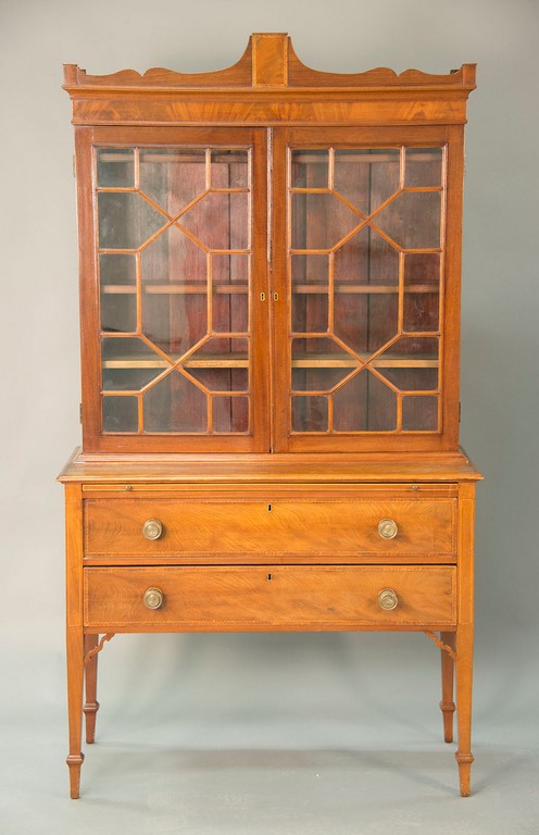Federal mahogany secretary desk in two parts, upper section with two glazed doors on lower section with pull out slide over two drawers all set on square tapered legs, circa 1790-1810 ht. 77 1/2 in. wd. 43 1/2 in. dp. 19 1/4 in.