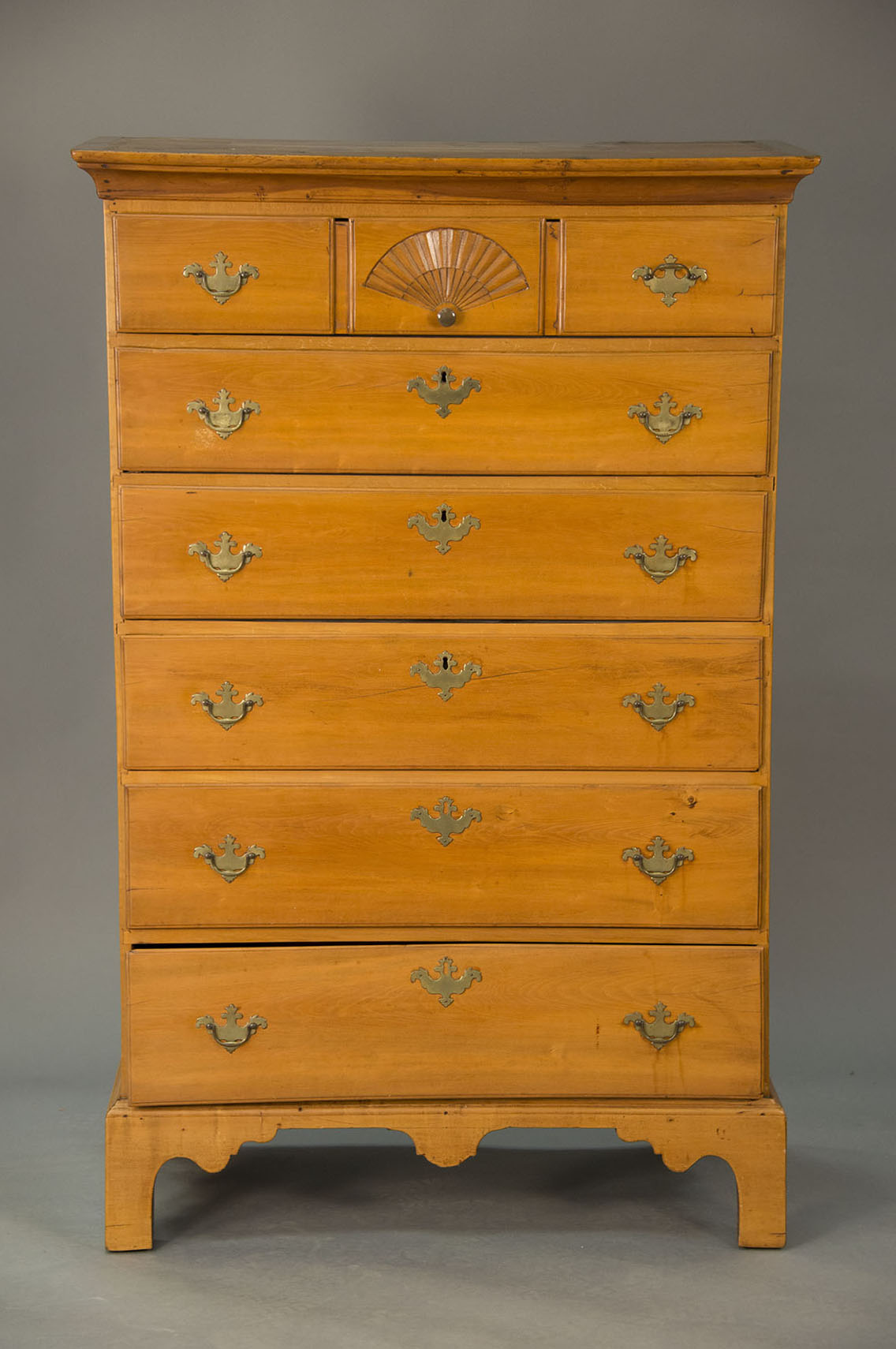 Maple tall chest having cornice molded top over six graduated drawers, top drawer is faux three drawer with central fan carving. ht. 60 in. wd. 36 in. dp. 20 in.
