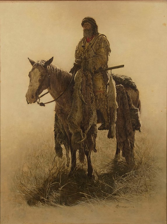JAMES ELLIOTT BAMA 1926 Timber Jack Joe – Mountain Man, Crow Agency, Montana oil on masonite signed lower right Bama 72 Hammer Galleries stamp on reverse #22335-18. Written on reverse James E. Bama 1972 Reproduction rts reserved, Crow Agency, Montana 23 3/4 x 18 Provenance: Hammer Gallery 1973 Current Private Collection Exhibition: Hammer Galleries May 15-May 26, 1973 Documentation Included: Painting featured on page one of Pictures on Exhibit, Collector’s Guide to World-Wide Art Shows, Summer Travel Issue May-June 1973