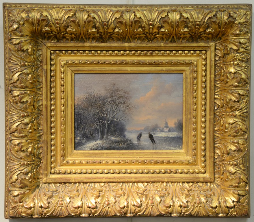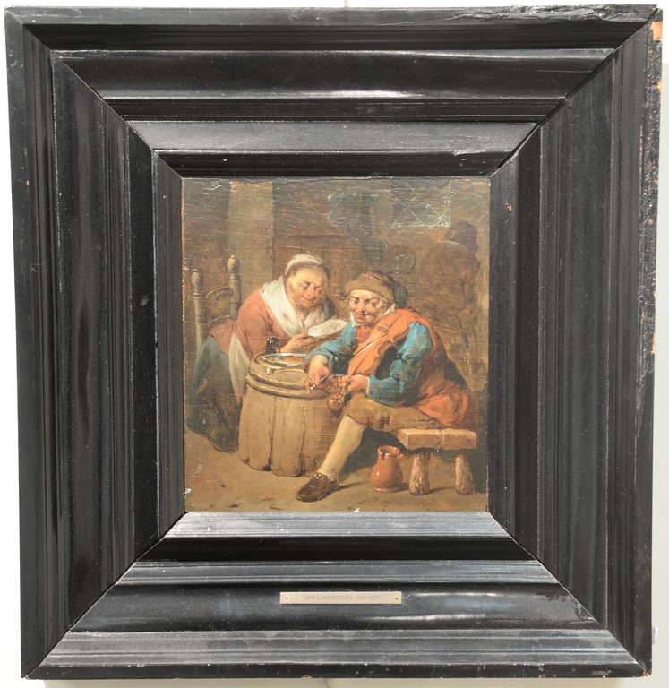 AFTER JAN BAPTIST LAMBRECHTS 1680- after 1731 Interior Scene with Two People oil on panel unsigned marked on plaque JAN LAMBRECHTS 1680-1750 10 1/4 x 9 1/4