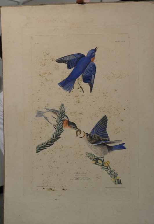 JOHN JAMES AUDUBON 1785-1851 Blue-Bird plate CXIII No. 23 hand colored engraving Drawn from Nature by J. J. Audubon FRS,ELS, Engraved, Printed, and Coloured by R. Havell, London 1831, Blue-Bird SYLVIA SIALIS having J. Whatman watermark laid down, foxing and mounted 28 3/4 x 19 7/8 plate size 19 3/4 x 12 1/2