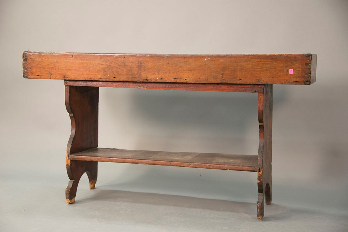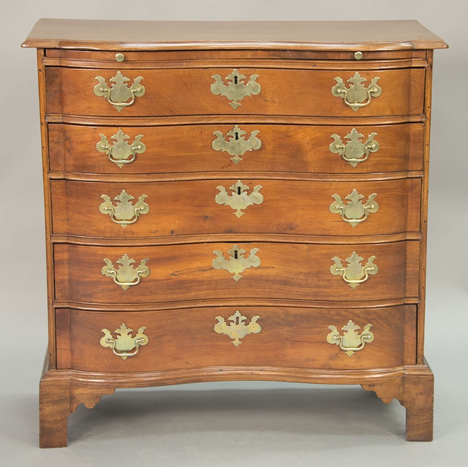 Chippendale mahogany reverse serpentine bachelor’s chest having shaped top over pull out dressing slide over conforming case of five reverse serpentine graduated drawers with cock beaded dividers all set on cut out bracket feet, with original Chippendale brasses, probably Massachusetts circa 1775 bottom of feet pieced. ht. 35 in. case wd. 32 1/4 in. dp. 15 1/4 in. Provenance: Nathan Liverant & Son Estate of Sylvia Leven