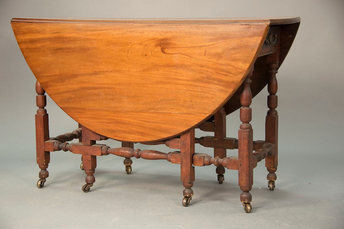 Gateleg table with oval drop leaves on block and turned base, base 17th – 18th century top and drawer replaced. ht. 28 in. top closed: 15 x 45 top open: 52 x 45