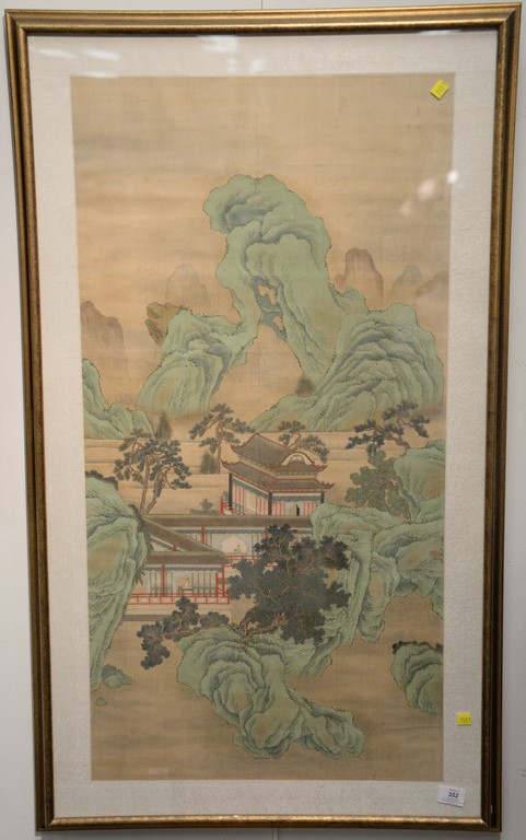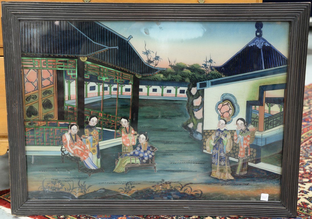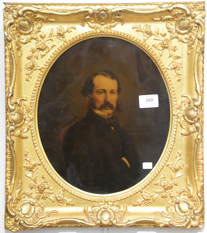 Double reverse painting on glass, portrait of a gentleman with a mustache sitting in a Victorian chair, this appears to have two pieces of glass together and painted on both pieces to create a three dimensional effect. 11 1/2 x 13 1/2