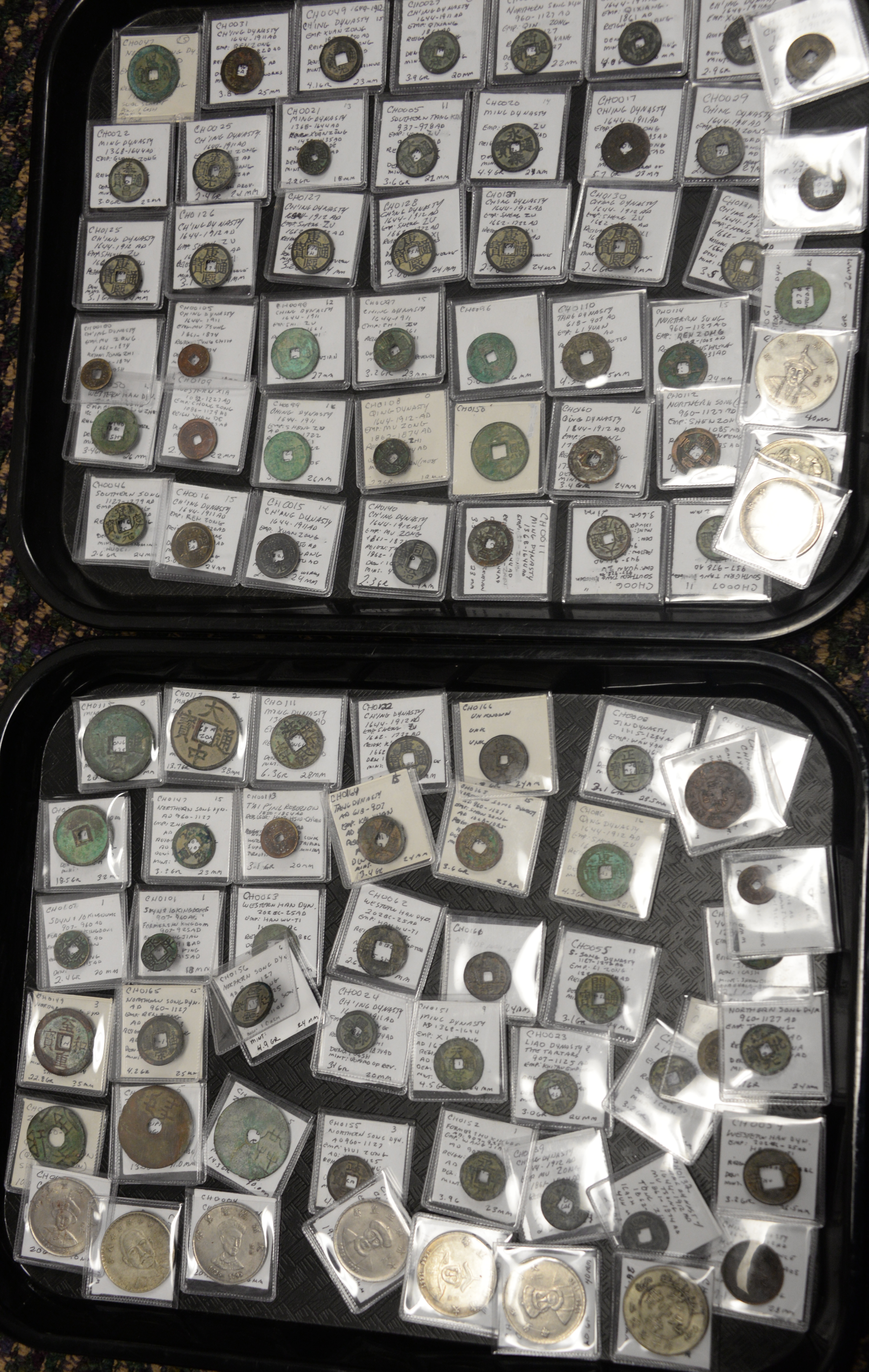 Large group of approximately 144 Chinese coins, 19 are silver 20th century and the rest are bronze, including Ming, Zhou, Tang, Song, Shu, Qing, Soyn, Ching, Liao, Yuan, Chin Dynasty etc.