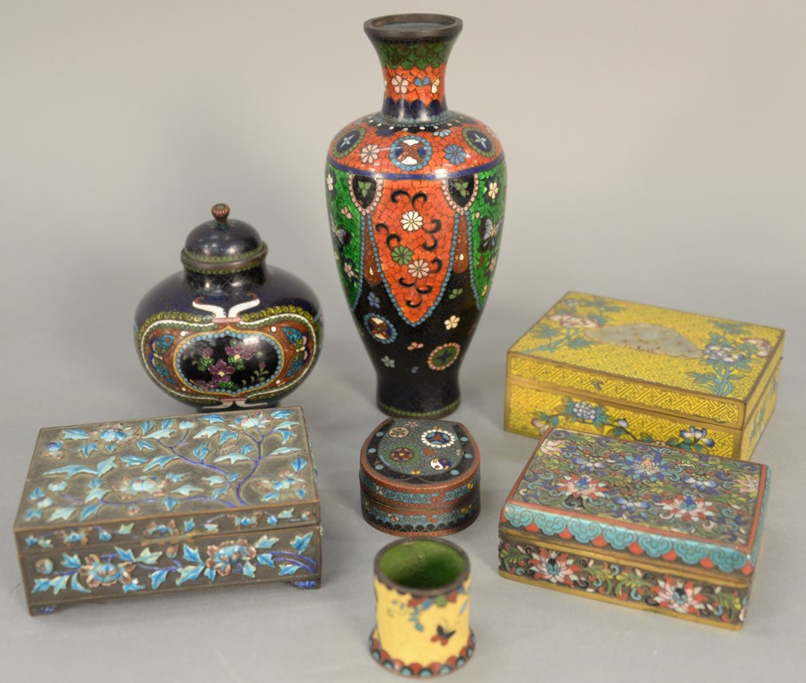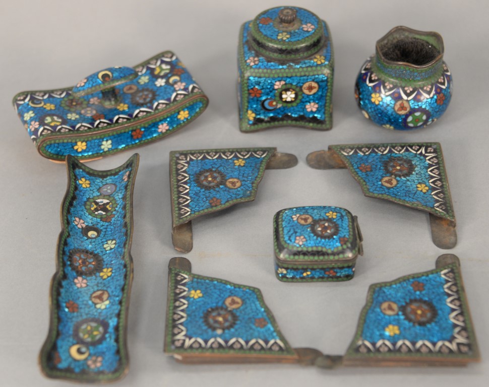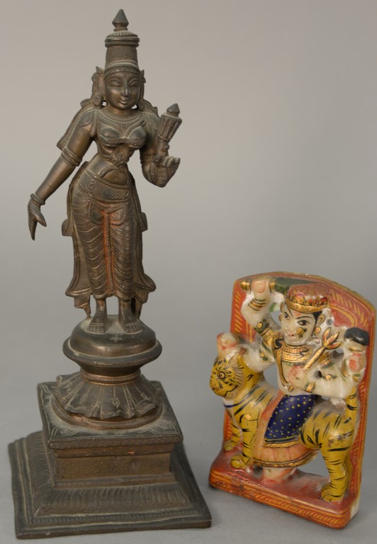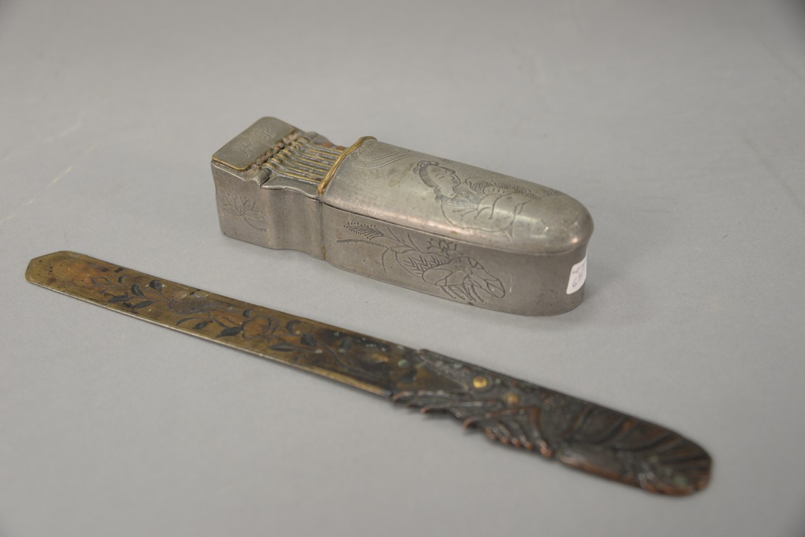 Two piece lot to include Chinese pewter cosmetic or patch box with mirror in lid, probably 18th – 19th century and bronze mixed metal page turner, handle with lobster and multi metal shell on reverse. page turner: lg. 11 in.