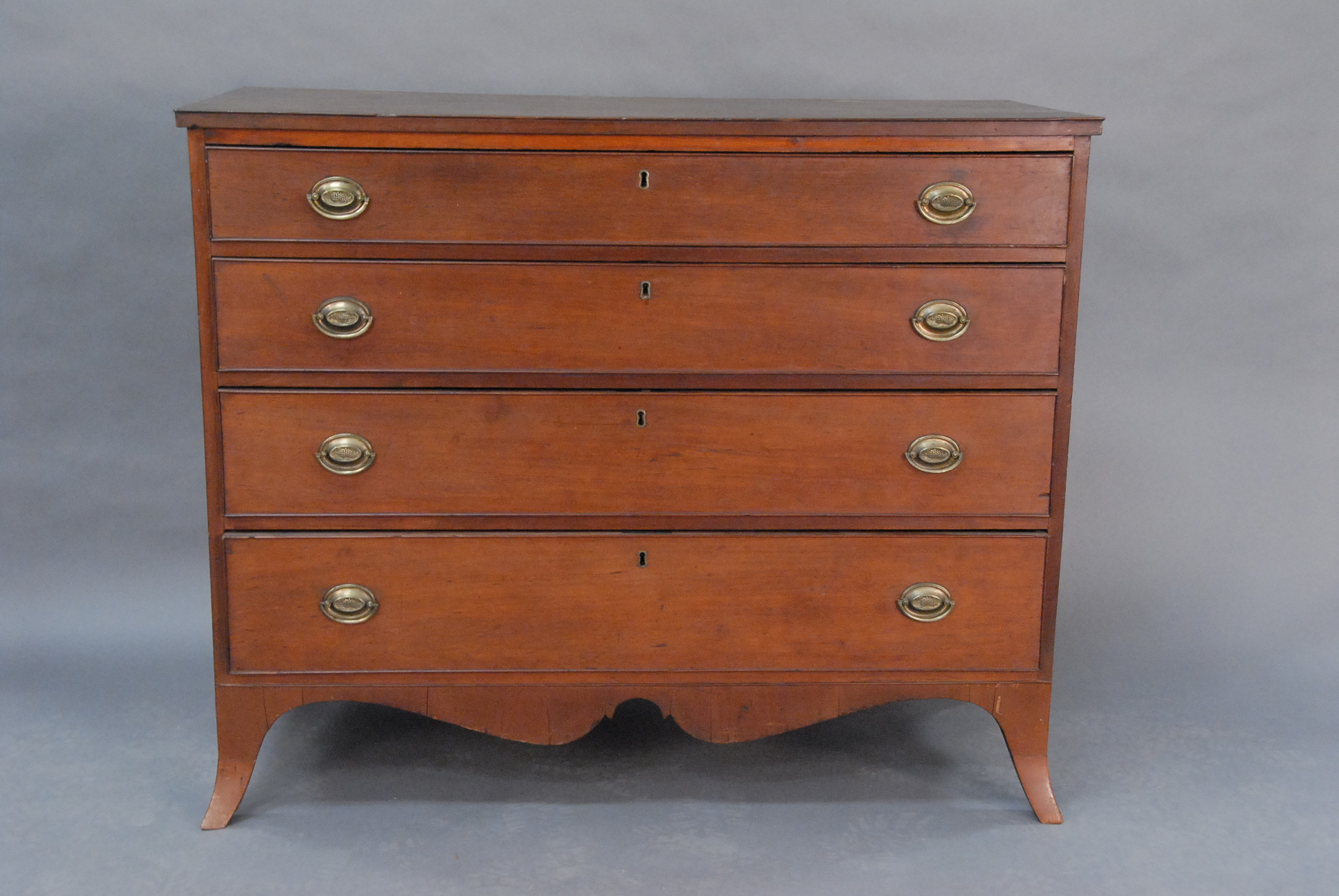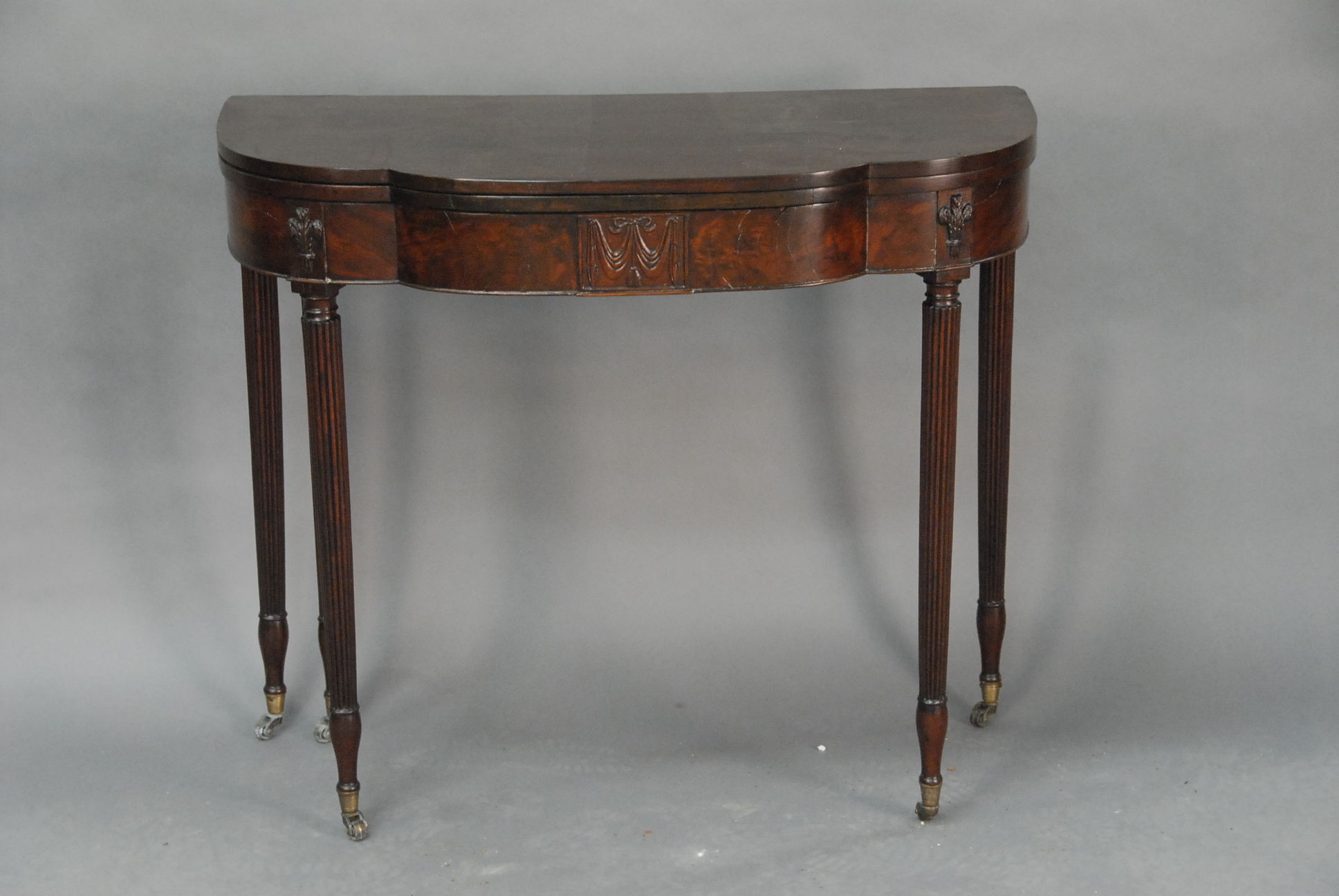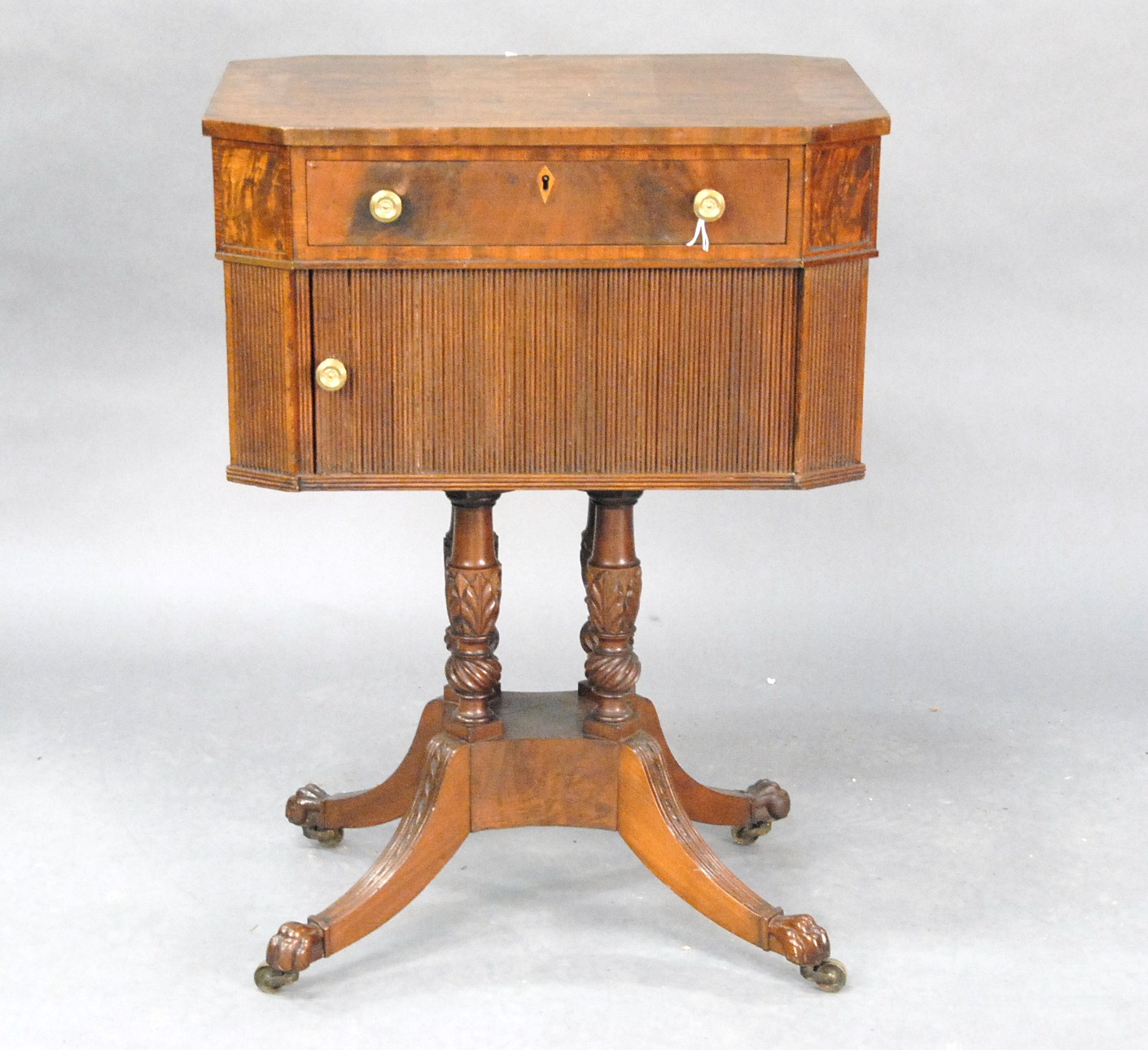 Federal mahogany work table with opening top over tambour door, opening to reveal two fitted drawers on turned legs, ending in downswept members with paw feet.