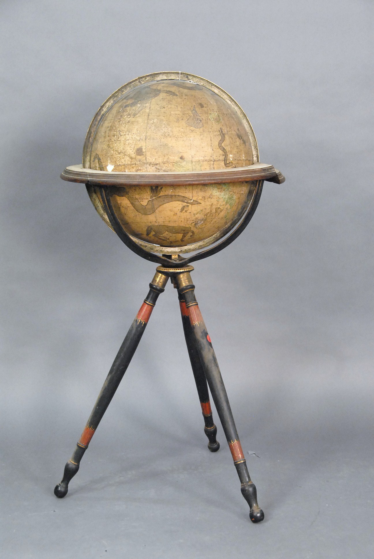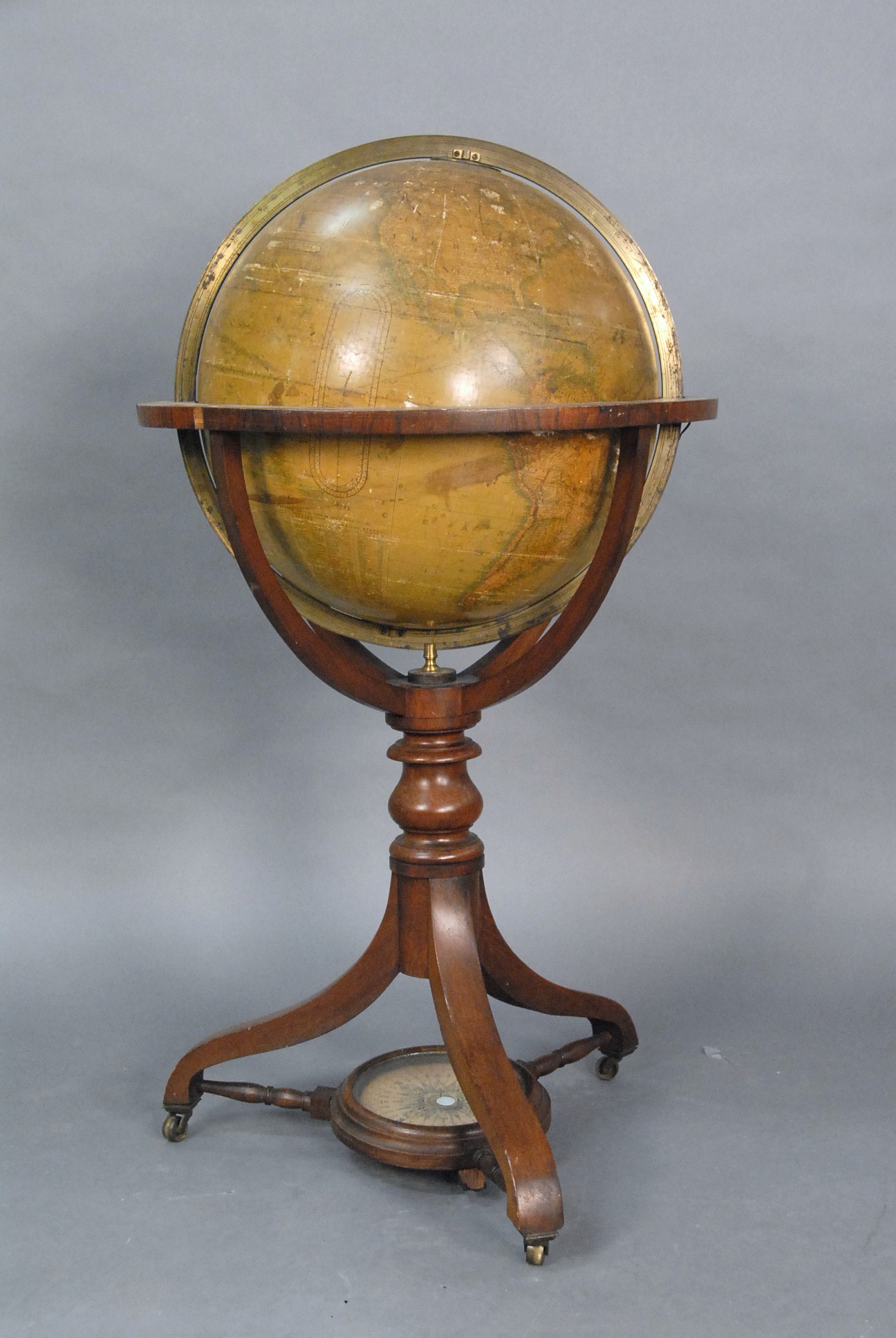 A Malby’s Terrestrial Globe on mahogany stand dated 1858, this globe is inscribed Malby’s / terrestrial globe / complied from the latest / and the most authentic sources / including all the recent / Geographical Discoveries / manufactured and published under the superintendence of the / society for the Diffusion of useful knowledge / by THO S MALBY and SON / map and globe sellers to the Admiralty / Jan 1, 1858 / Edited by… and with the contemporary label inscribed BENJAMIN PIKE & SONS AGENT’S / opticians & c / 518 Broadway, New York.