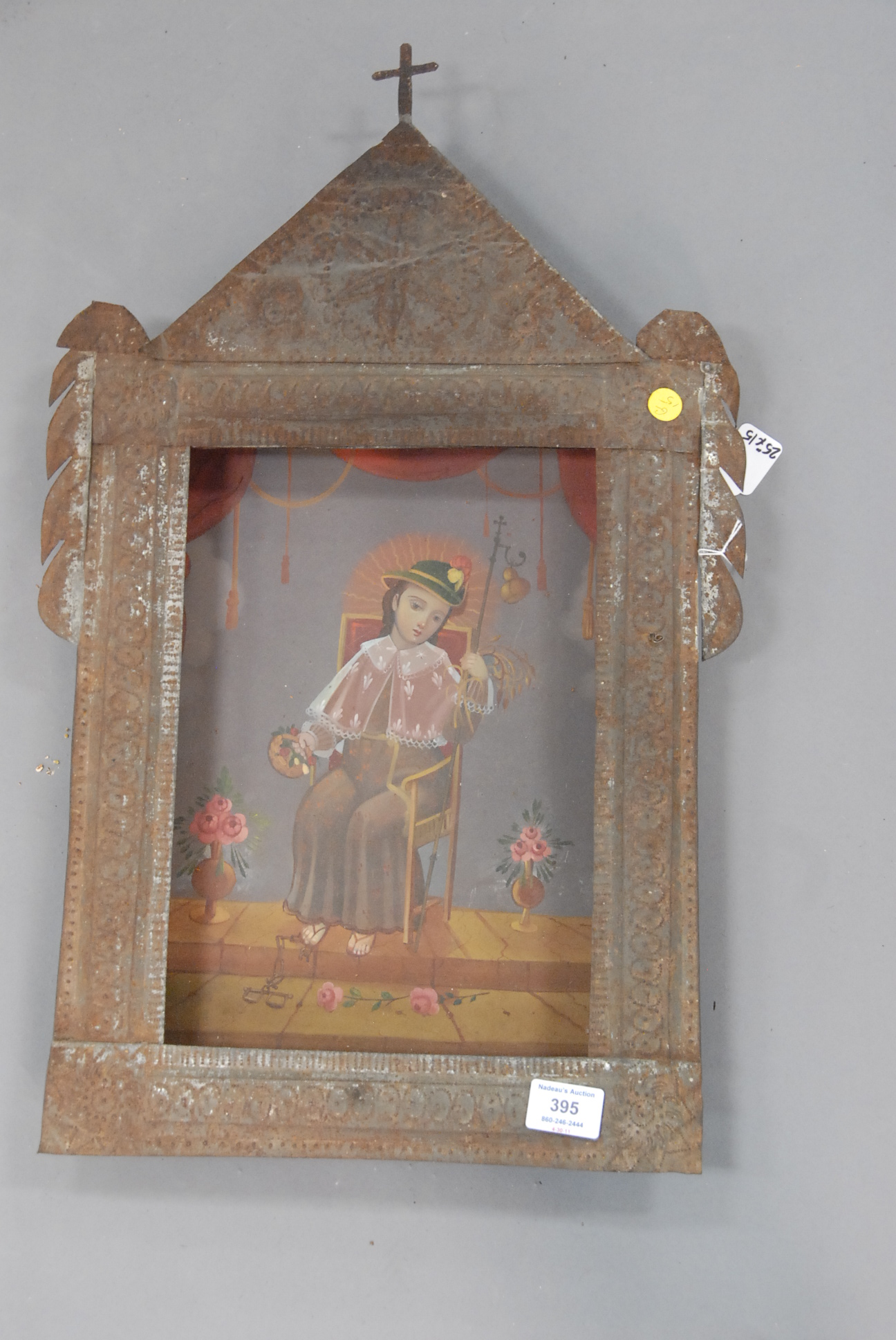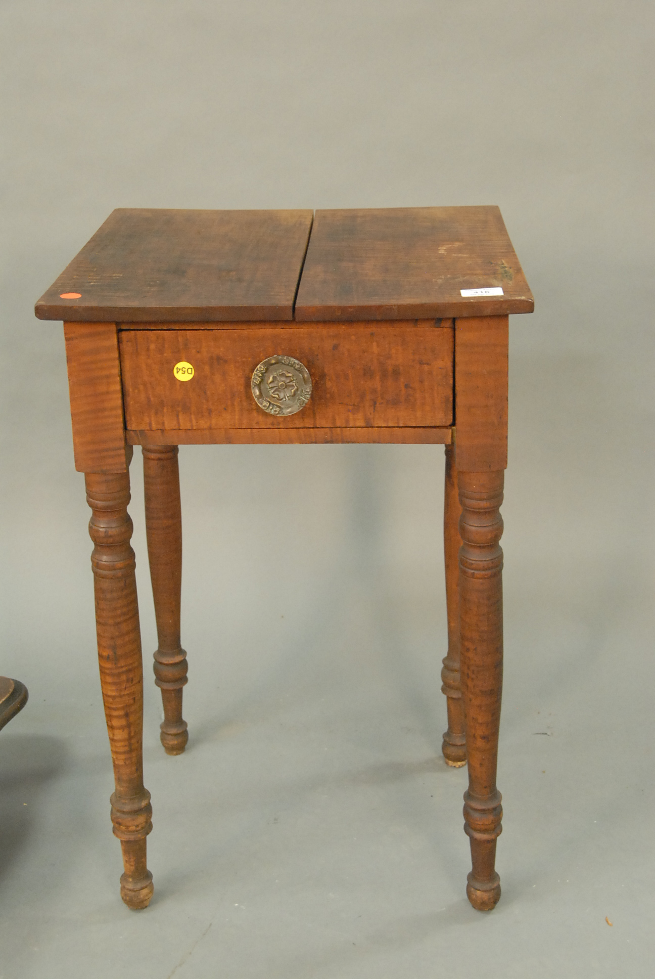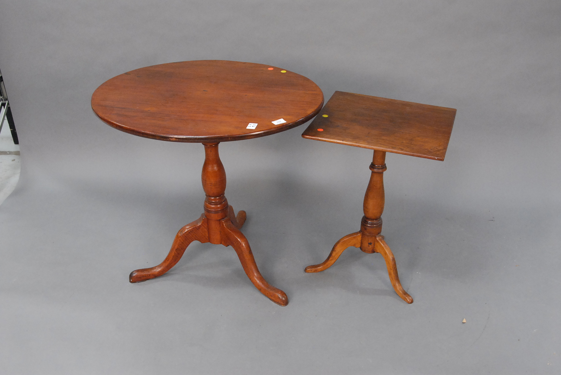 Primitive oval tip table along with a primitive candlestand with square top on turned shaft.