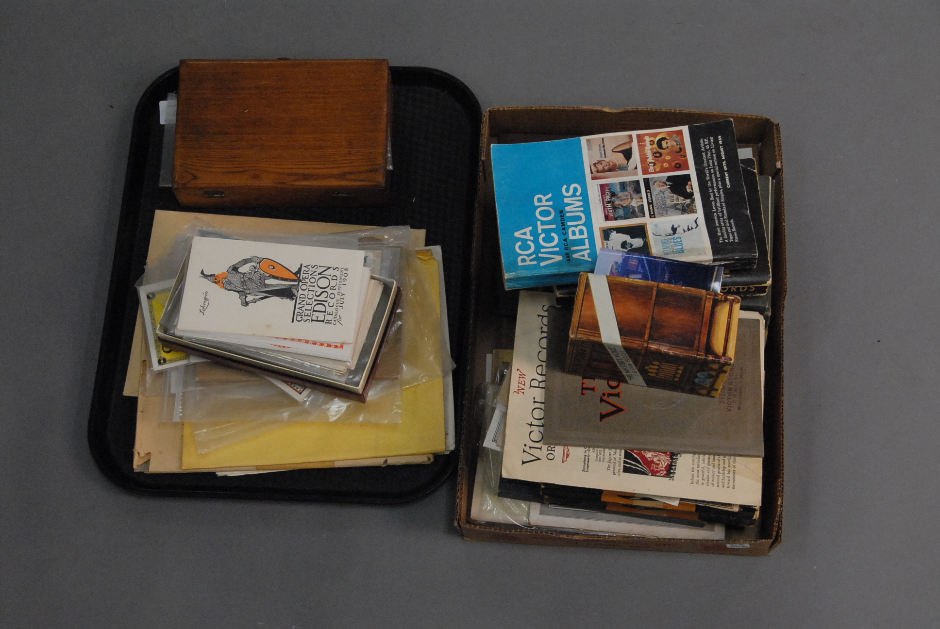 Two tray lot of Edison record catalogs and supplements, Victor catalogs, Victor puzzle, and record catalogs.