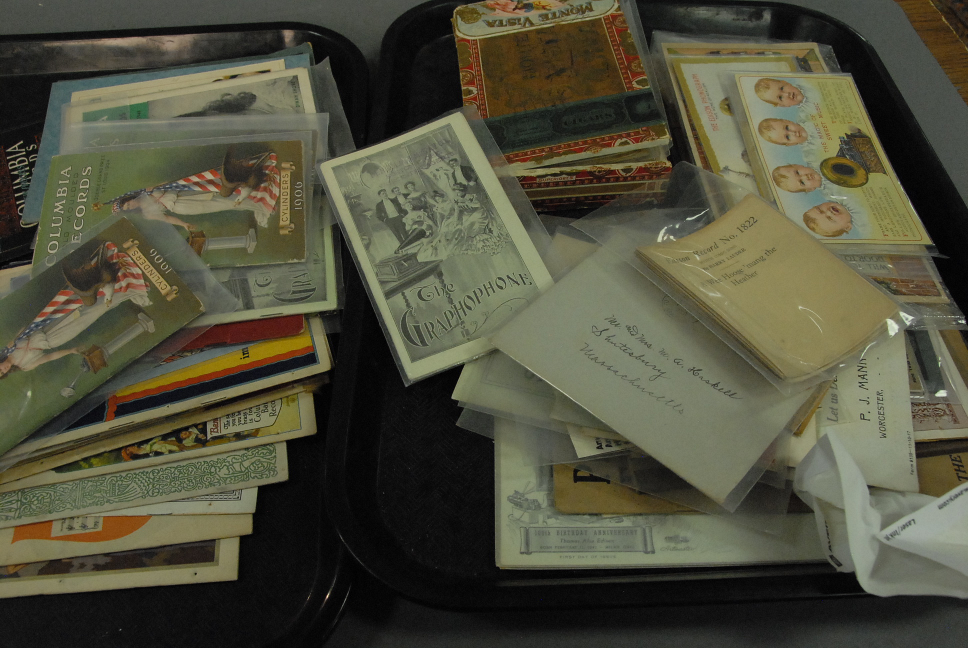 Two tray lots of Columbia advertising, catalogs, trade cards, etc.
