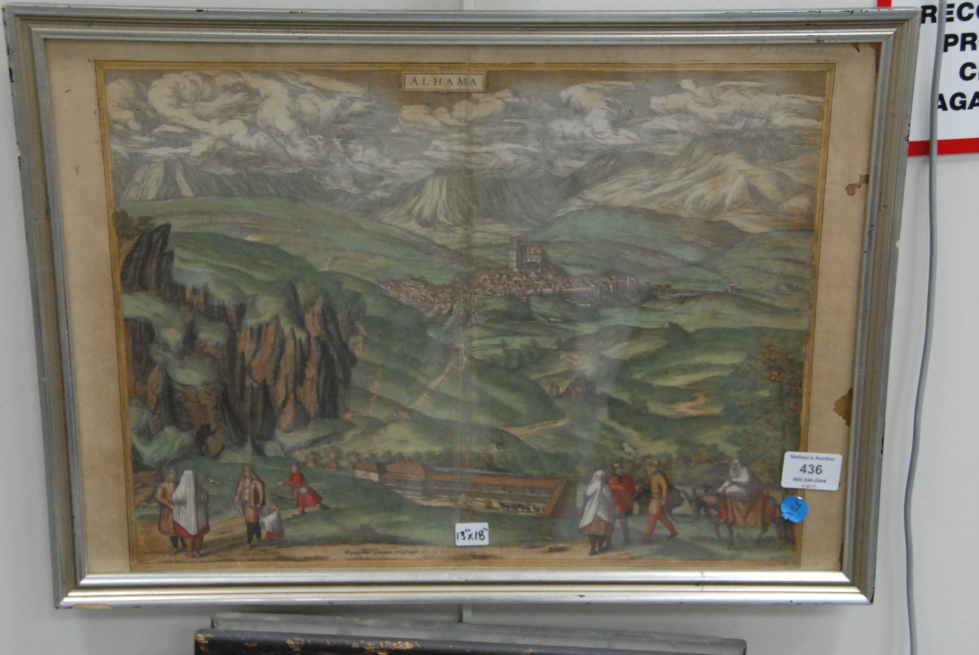 Early hand colored print Alhama Depingebat Georgius Hoefnagle 1564, minor fold and imperfections.