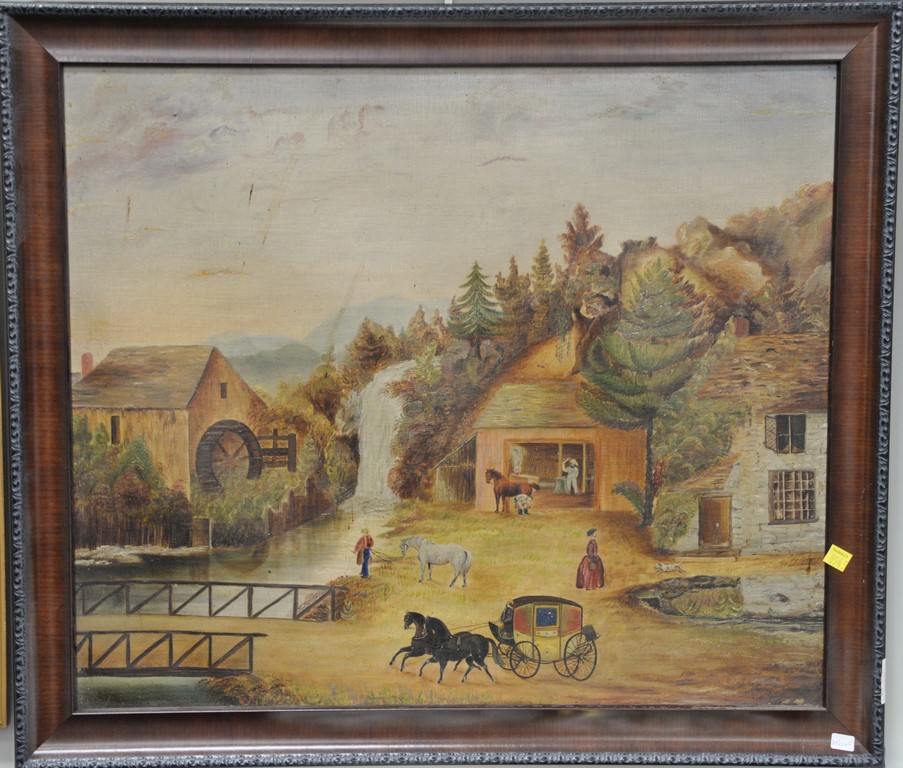 Near Eastern ivory group of man and woman,possibly wedding couple,in oxen/bull-drawn covered cart, flanked by five attendants, sixth missing,closed in a glass and metal box.