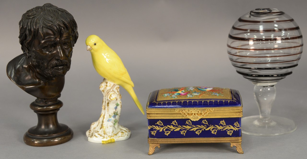 Five piece lot of Japanese ivory, figure of a woman holding a birdcage, with damage to index finger 20th century Japanese ivory figure of a dancing geisha, damage, 20th century Japanese ivory figure of a musician serenading toads, as is, 19th century – 20th century pair of Chinese seatite/soapstone dancers, 20th century.