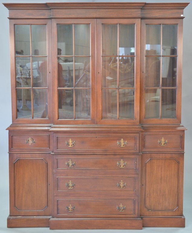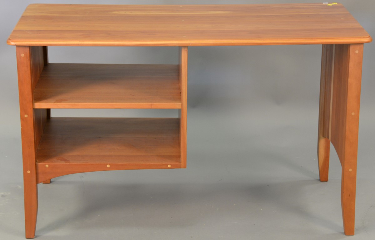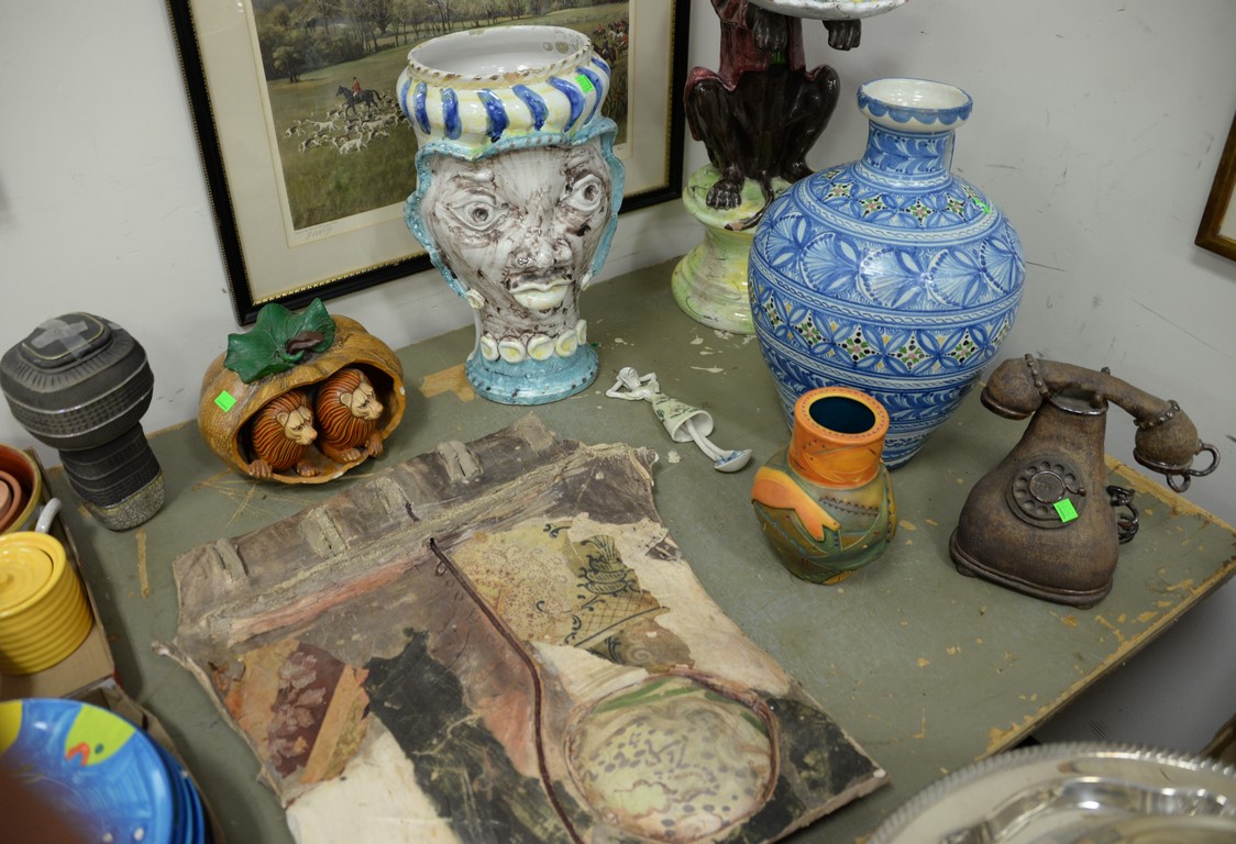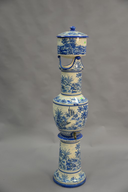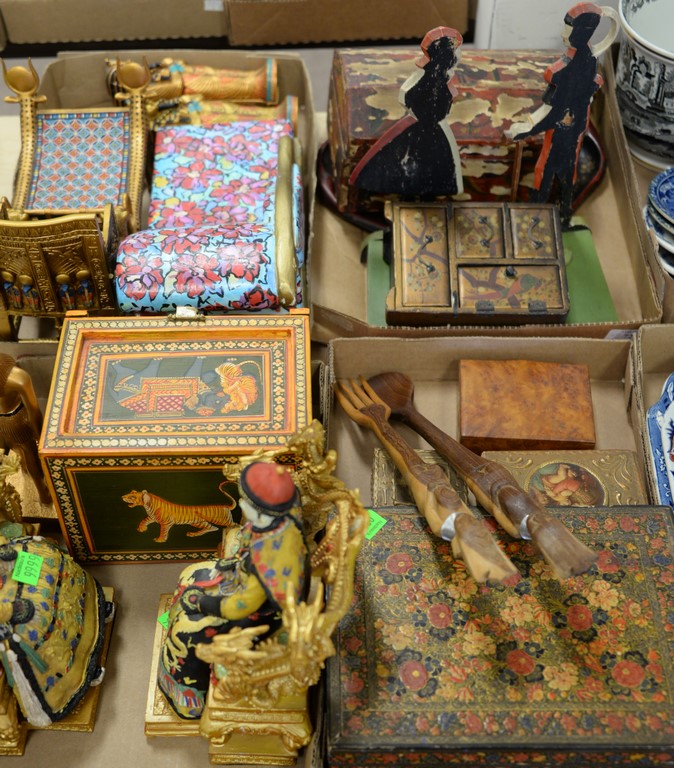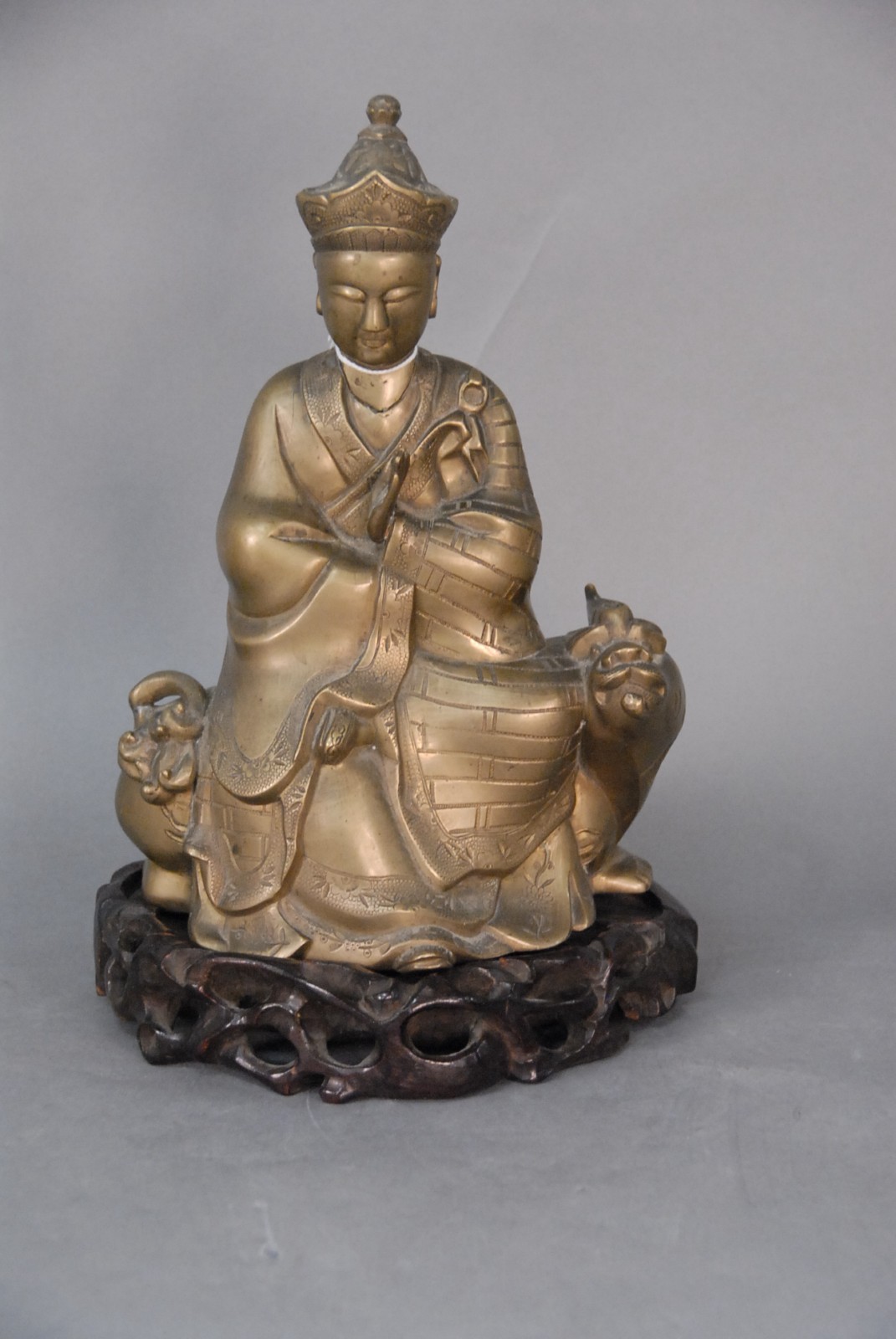 Large fine Japanese bronze figure of man holding an archaic censer ding over his head and standing before a writing table upon which are a brush, ink stone, and rest, table detached, one leg missing, one handle missing on censer and stylus/brush missing, 19th century – 20th century.