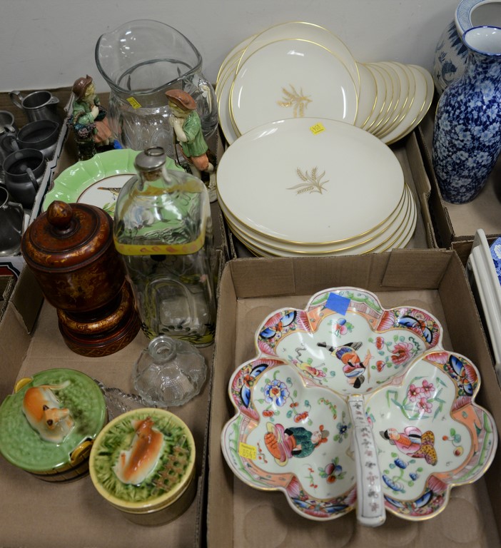 Chinese carved hardwood, ebony, seated Quan Yin in classic pose with gold painted trim, 20th century, and two Chinese hardwood ruyi scepters, 20th century.