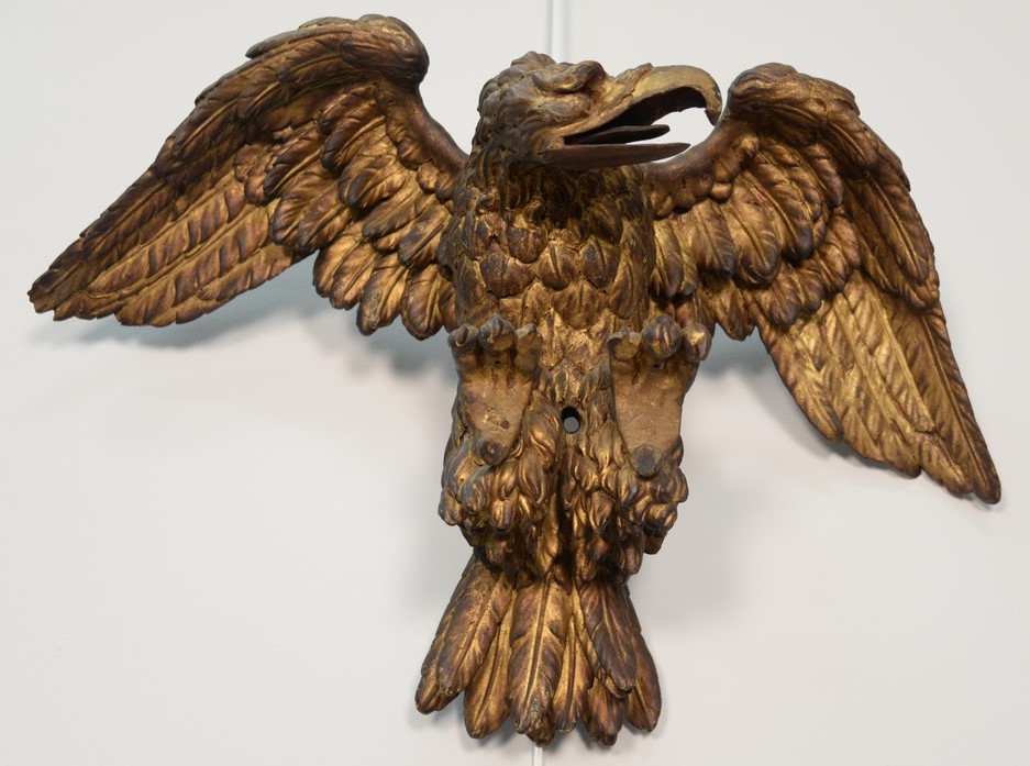 Attributed to Samuel McIntire, carved giltwood eagle with spread wings in high relief carving, realistically carved with out-stretched talons in old gilt surface, late 18th-early 19th century.