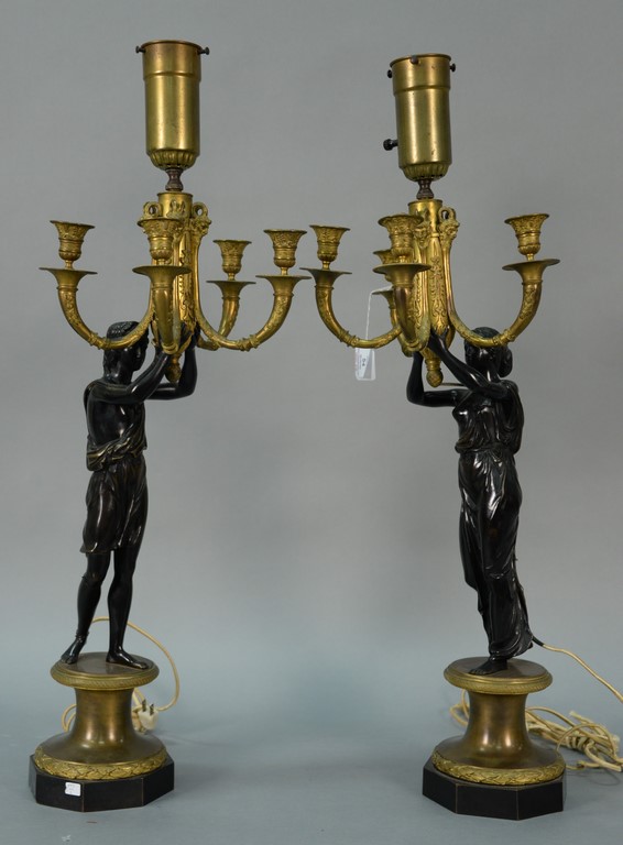 Pair of gilt and patinated bronze four light figural candelabra, late 19th century male and female classical figures holding urns issuing branches with satyr head terminals on bronze pedestal bases. ht. 26 1/2in., wd. 11in.