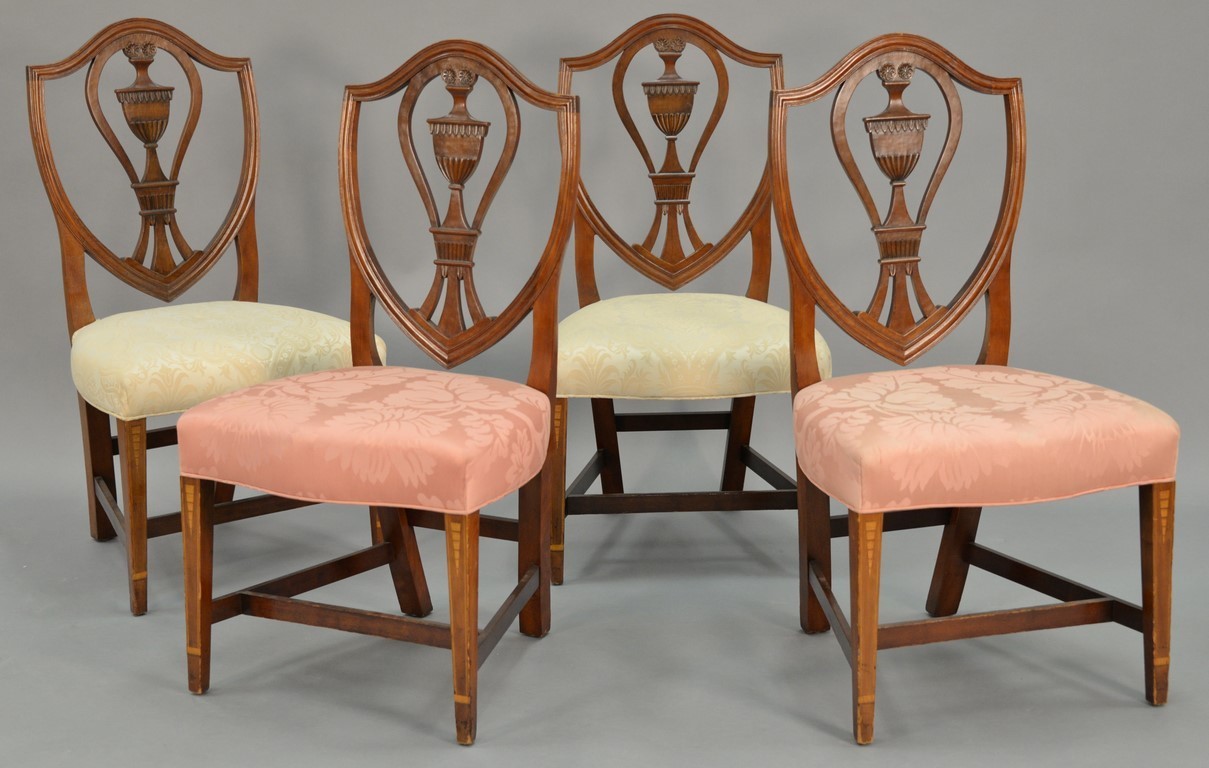 Set of four Margolis State House style side chairs each with carved urn and shield back and fully upholstered serpentine seats set on icicle inlaid square tapered legs, signed Margolis, each having Aetna metal tag. ht. 39in.