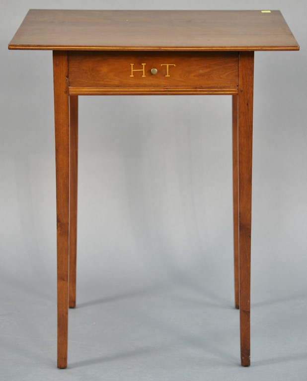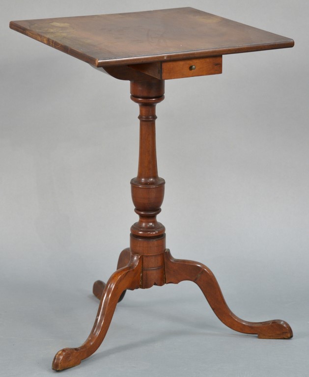 Federal cherry candlestand having a square top with drawer on vase turned shaft set on tripod base. height 26 1/2 inches, top: 17 1/2 x 17 7/8 Provenance: Estate of R. Donald Bassette