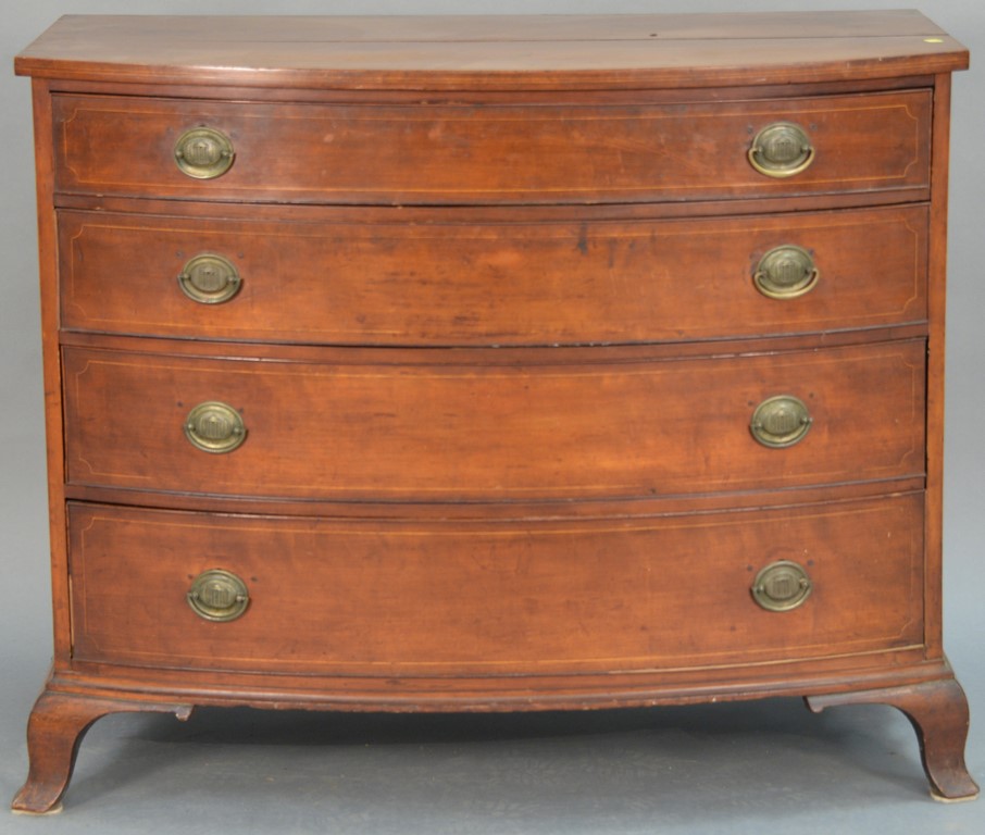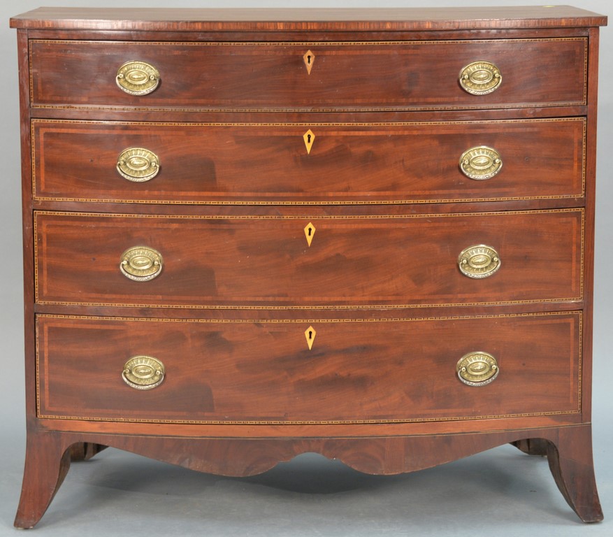 Federal mahogany chest of four drawers with bowed fronts, each with inlaid surrounds, all set on flanked French feet, circa 1790.