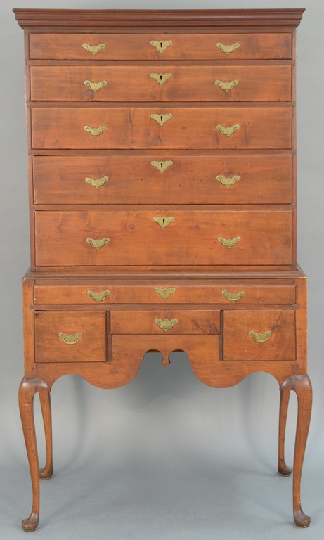 Queen Anne flat top highboy in two parts, upper portion with cornice molded top over five graduated drawers set on lower portion with one long drawer over three short drawers over cyma carved skirt set on cabriole legs ending in pad feet, original brasses, probably Southeast Connecticut, circa 1740. height 67 1/2 inches, width 35 inches Provenance: Estate of R. Donald Bassette