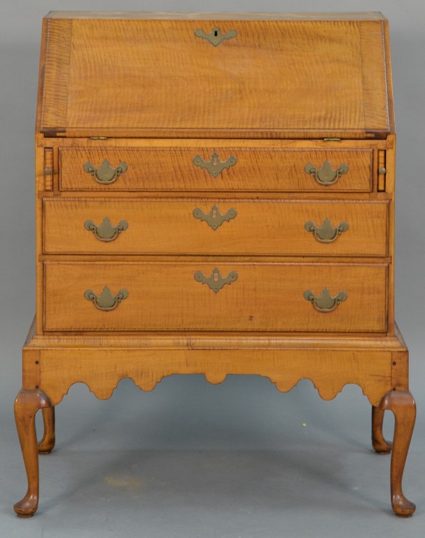 Diminutive Queen Anne style desk on frame having slant lid with serpentine interior over three drawers set on base with cabriole legs ending in pad feet.