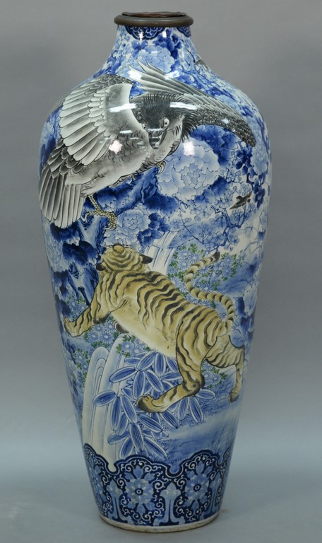 Japanese porcelain palace vase depicting tigers and birds of prey, top cut now fitted with brass sleeve, 19th century.