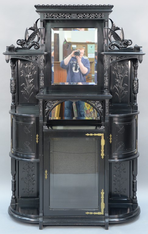 Kimbel & Cabus aesthetic ebonized etagere having centered mirror flanked by carved winged dragons over shelves and two bowed doors and center lower bevel glass door. height 77 1/2 inches, width 49 inches Provenance: Estate of Dr. Steve Leder