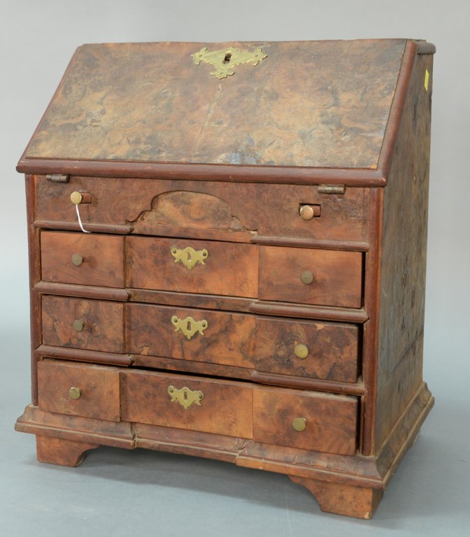 Miniature burlwood desk with slant front over three drawers set on bracket base, Continental 18th century.