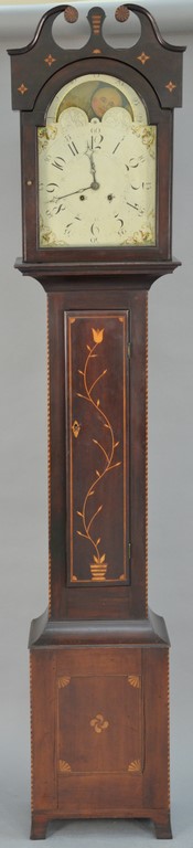 Cherry tall case clock having broken arch top over tombstone door over rectangular door with floral and vine inlay on base with pinwheel and fan inlays flanked by stripe inlay ending in bracket feet, top with pinwheel and star inlay, tombstone painted metal dial with moon phases and brass works, circa 1780.