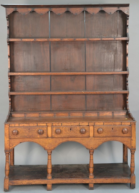 Oak Welsh cupboard in two parts, upper section having cornice molding over open shelves on lower section having three drawers set on cabriole legs ending in pad feet. ht. 77in., wd. 68 1/2in., dp. 20in.