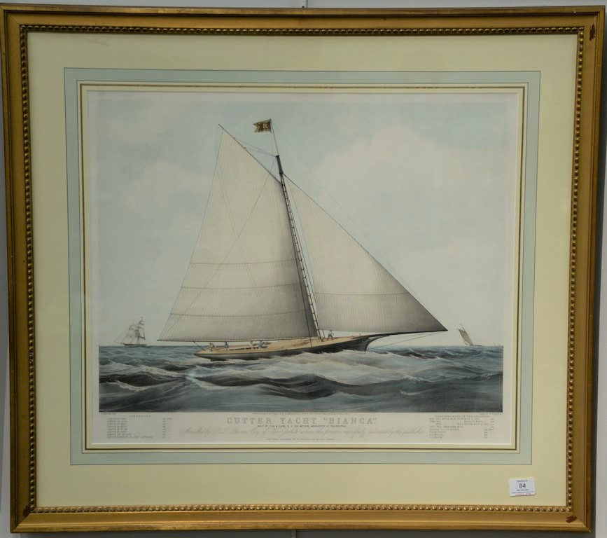 Nathaniel Currier large folio hand colored lithograph Cutter yacht ‘Bianca’ Entered according to act of Congress in the year 1854 by N. Currier marked lower left: C. Parsons, Del marked lower right: Lith by N. Currier sight size 20 3/4 x 24 3/4 Provenance: Property from Credit Suisse’s Americana Collection