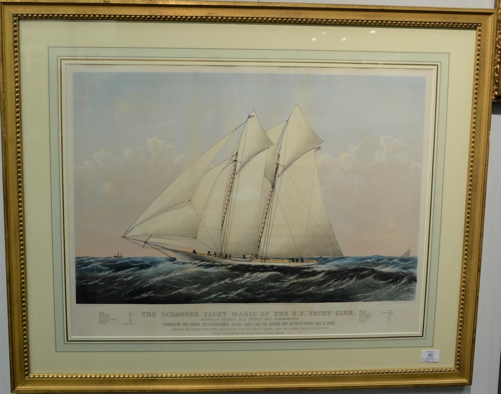 Currier & Ives large folio hand colored lithograph The Schooner Yacht Magic of the N.Y. Yacht Club Franklin Osgood Esq owner and Commander winner of the Great International Yacht Race for the Queen’s Cup at New York Aug. 8, 1870 marked lower left: Published by Currier & Ives sight size 21 1/4 x 28 Provenance: Property from Credit Suisse’s Americana Collection