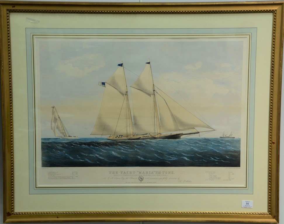 Currier & Ives large folio hand colored lithograph The Yacht ‘Maria’ 216 Tons Entered according to act of Congress in the year 1861 marked lower left: C. Parsons, Del marked lower right: Lith Currier & Ives New York sight size 20 1/2 x 28 1/2 Provenance: Property from Credit Suisse’s Americana Collection