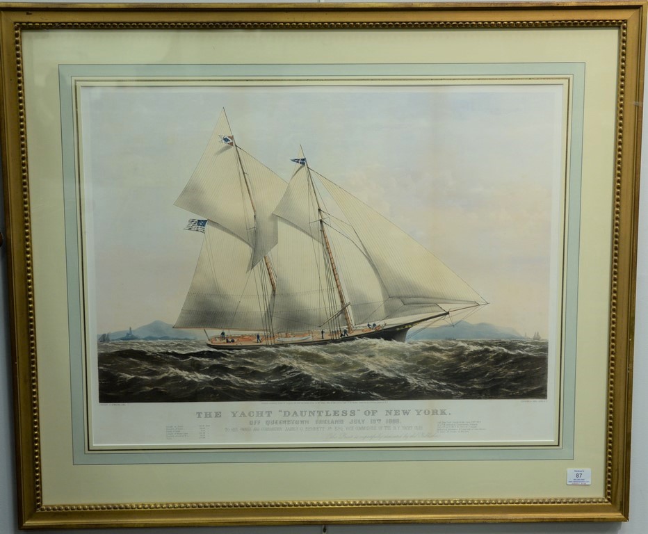 Currier & Ives large folio hand colored lithograph The Yacht ‘Dauntless’ of New York off Queenstown, Ireland July 13th 1869 marked lower left Parsons & Atwater, Del marked lower right: Currier & Ives Lith N.Y. sight size 22 x 28 1/2 Provenance: Property from Credit Suisse’s Americana Collection