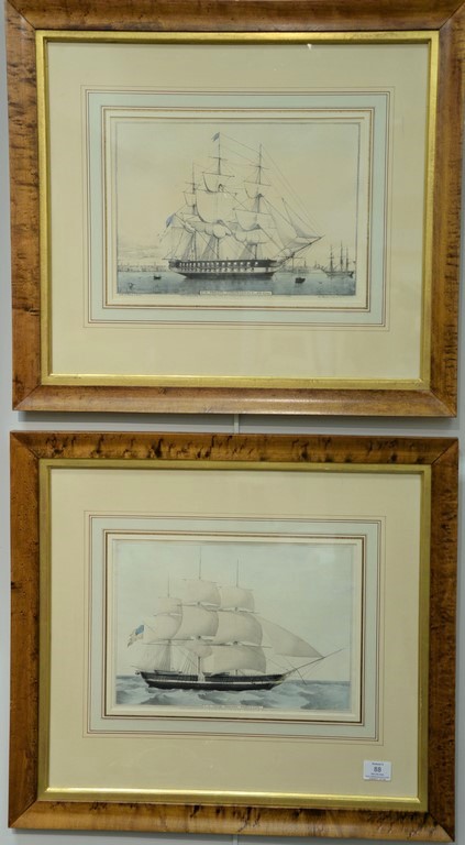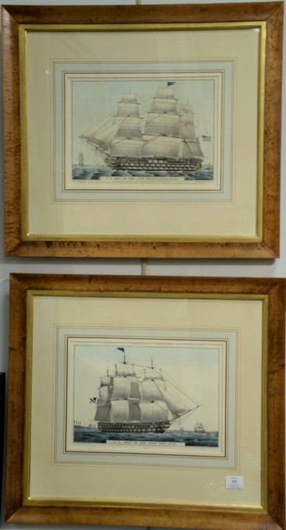 Nathaniel Currier pair of hand colored lithographs U.S. Ship of the Line Pennsylvania, 140 Guns entered in Congress 1846 marked lower left: Lith & Pub by N. Currier sight size 9 1/2 x 13 1/4 and U.S. Ship of the Line Ohio, 104 Guns Entered in Congress 1847 marked lower left: Lith & Pub by N. Currier sight size 9 1/4 x 13 1/2 Provenance: Property from Credit Suisse’s Americana Collection