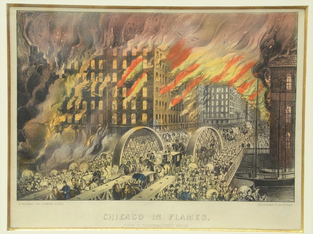 Currier & Ives pair of small folio hand colored lithographs Chicago in Flames Scene at Randolph Street Bridge marked lower left: Published by Currier & Ives and The Burning of Chicago marked lower left: Published by Currier & Ives sight size 10 x 13 Provenance: Property from Credit Suisse’s Americana Collection