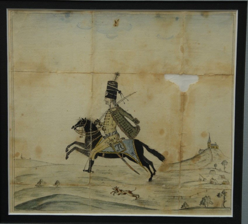 Pennsylvania Folk Art watercolor on paper of a French Soldier with dog, church, and houses in background, late 18th century.